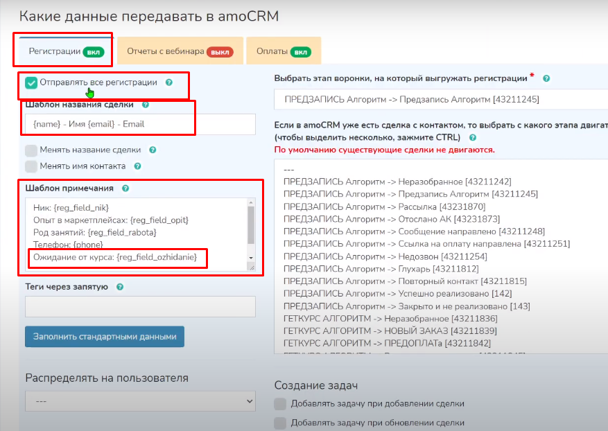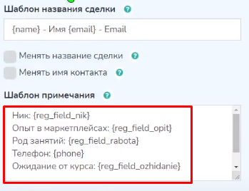 Ставим галочку - Отправлять все регистрации, задаем у шаблона Название сделки которое будет отображаться в amoCRM. В Шаблоне примечания прописываем все произвольные поля из квиза, в том числе ozhidanie.