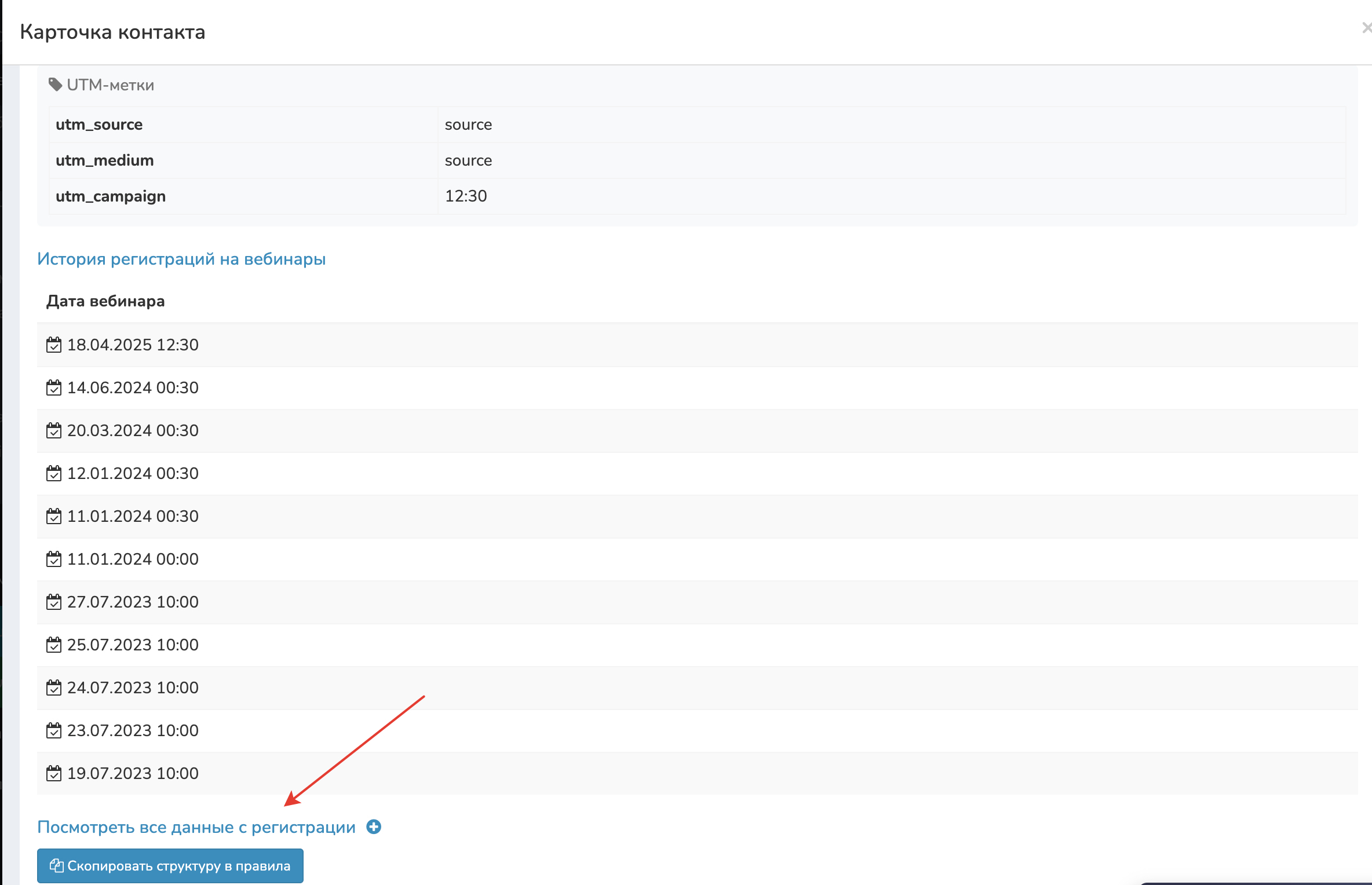 Далее нажмите на ID регистрации. Вы перейдете в карточку контакта. Нажмите "Посмотреть все данные с регистрации" — в этом разделе отображаются данные, переданные из квиза.