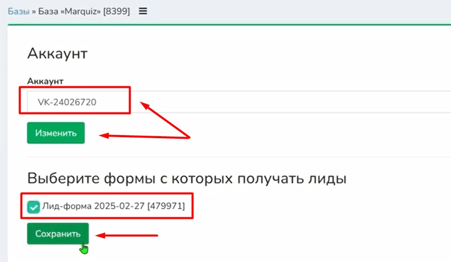 Указываем нужный рекламный аккаунт и выбираем формы, с которых будет идти сбор лидов.