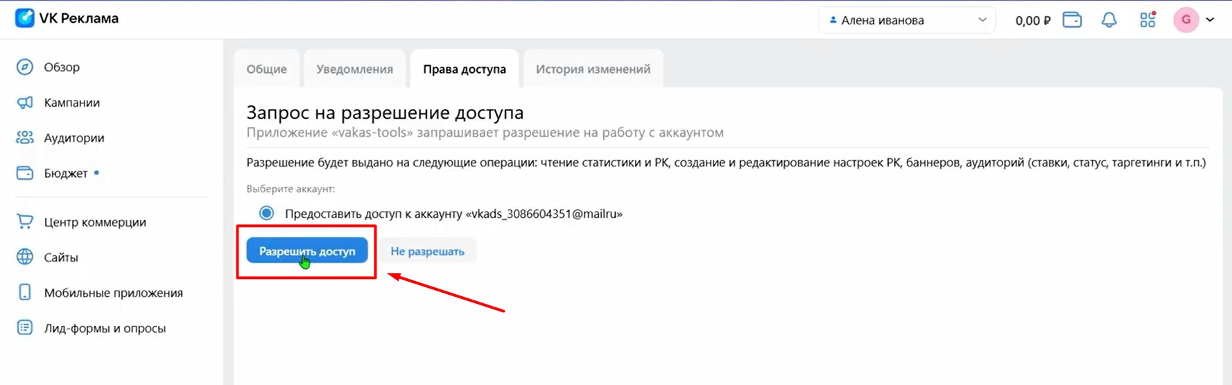 Переходим в раздел «Доступы» → «VK реклама».