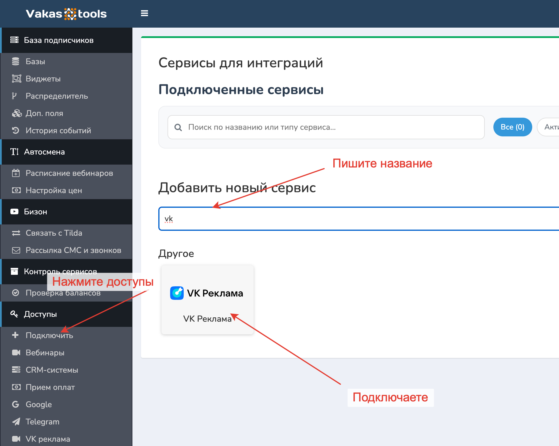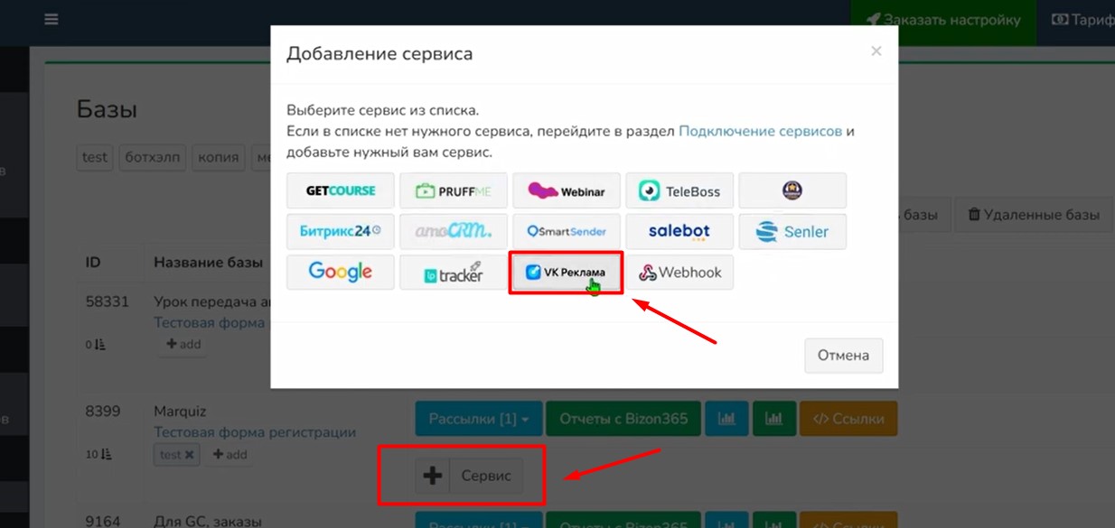 Нажимаем «Добавить сервис». Выбираем «VK Реклама».
