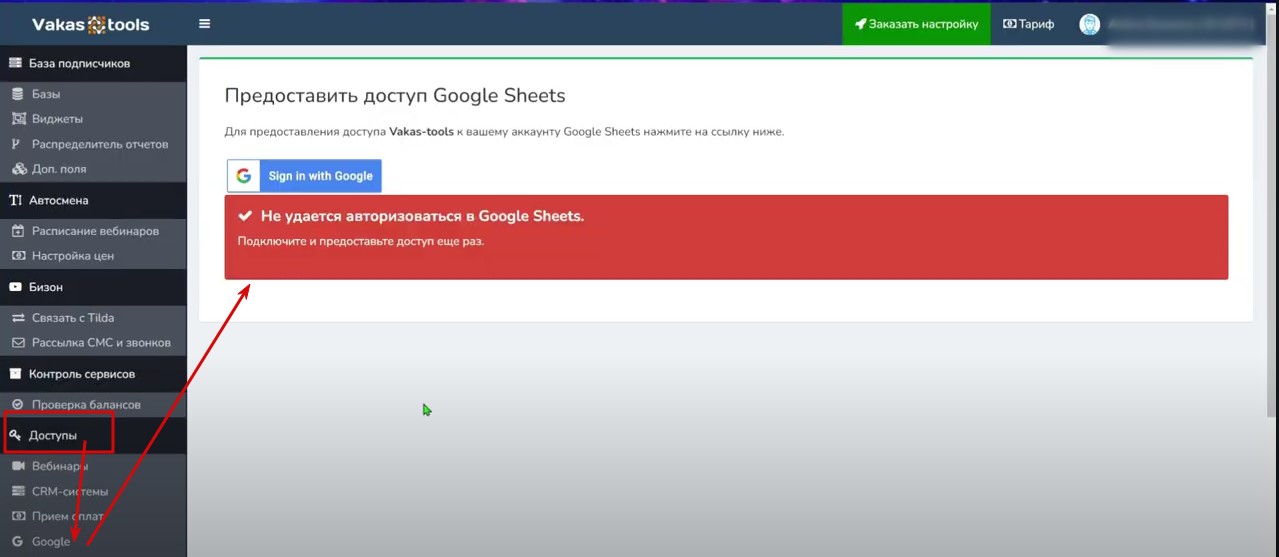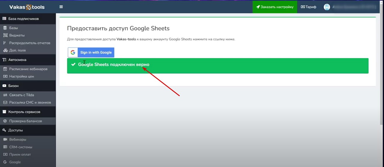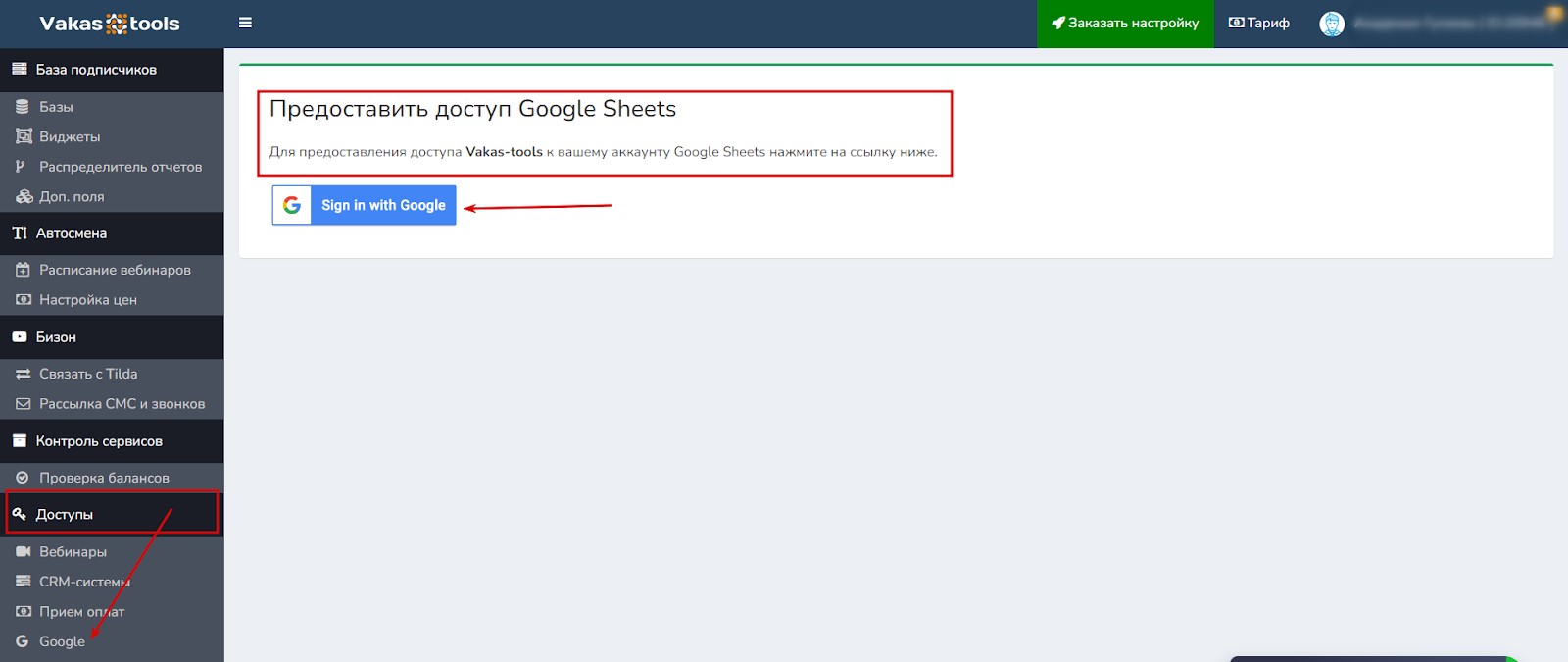 1 Слева в меню выберите «Доступы» - «Google». Нажмите на «Sign in with Google»