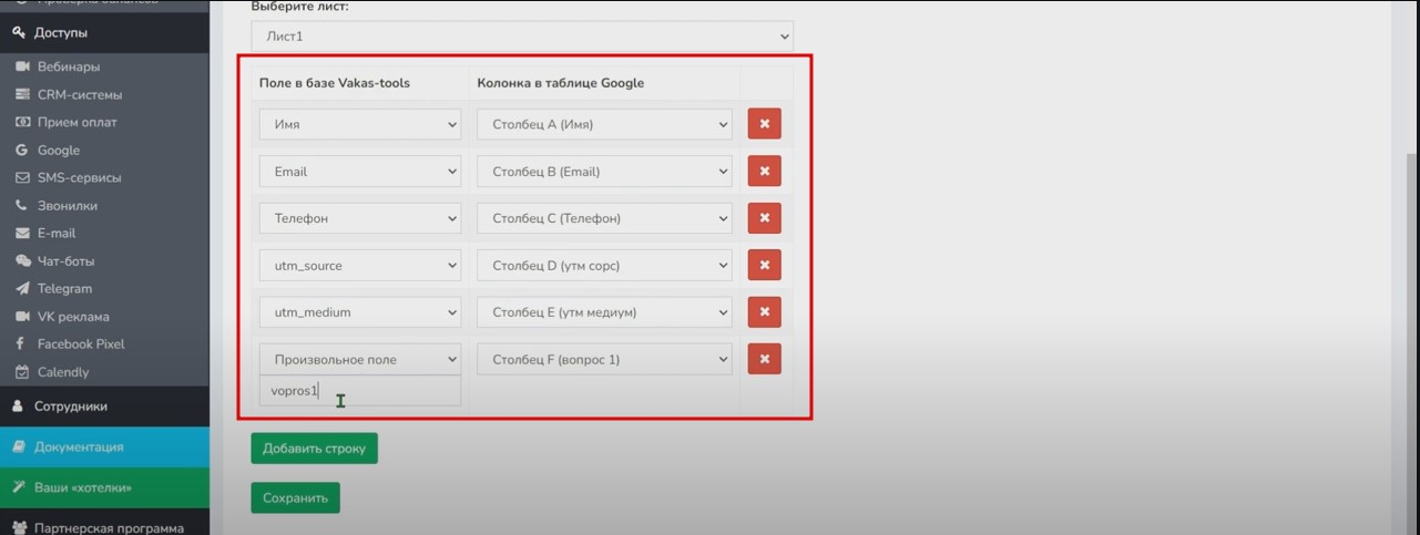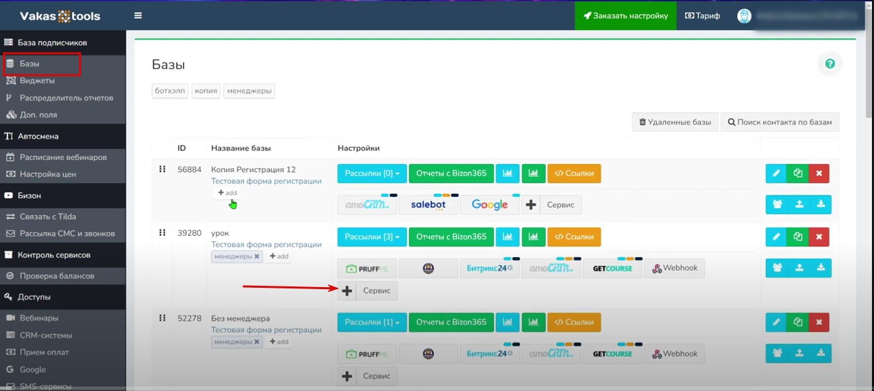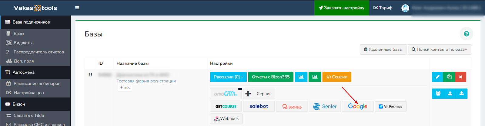 Перейдите в Vakas-tools. В меню слева выберите «Базы». У нужной Базы нажмите на знак + Сервис, в перечне сервисов (после успешного подключения аккаунта Google) появится возможность выбрать подключение Google.