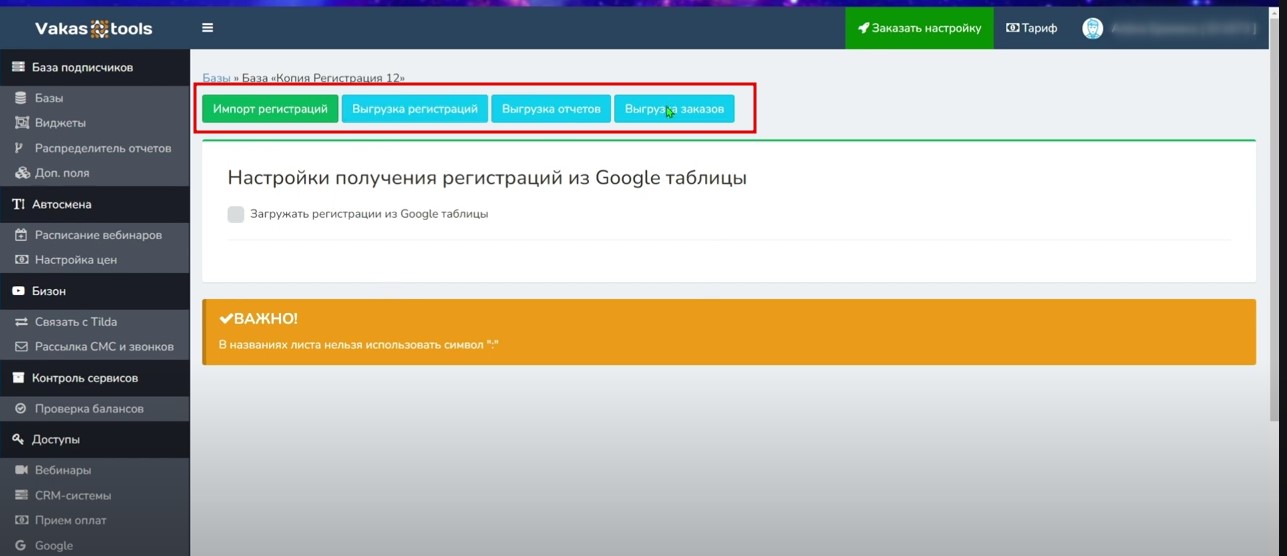 Для выгрузки регистраций — вкладка Выгрузка регистраций (из Базы Vakas-tools в Google таблицу).