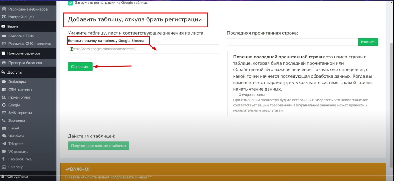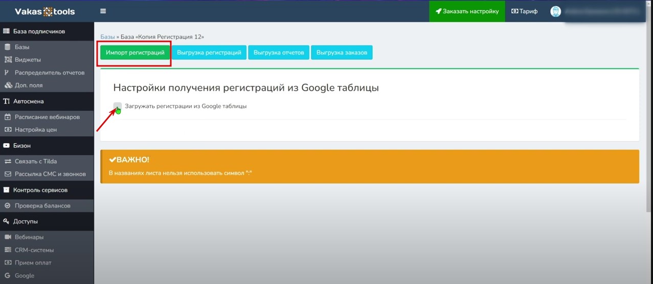 Для получения регистраций — вкладка Импорт регистраций (регистрации из Google таблицы). Например, подписчики заполняют анкету в Google и вы хотите чтобы эти данные приходили в Базу и дальше уже отправлять куда-то в CRM системы. Для этого обязательно ставим галочку загружать регистрации из Google таблицы.