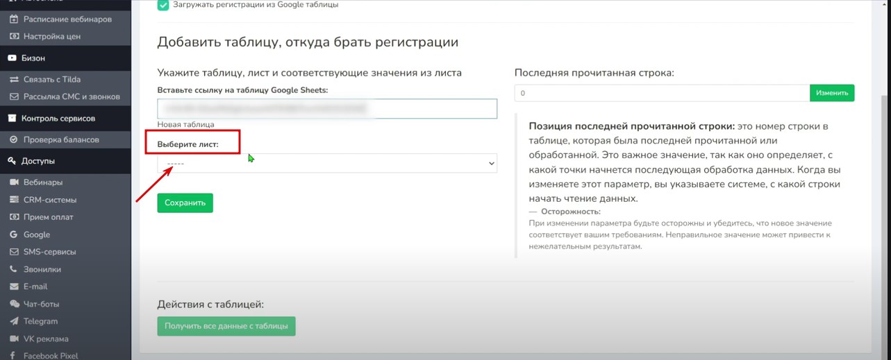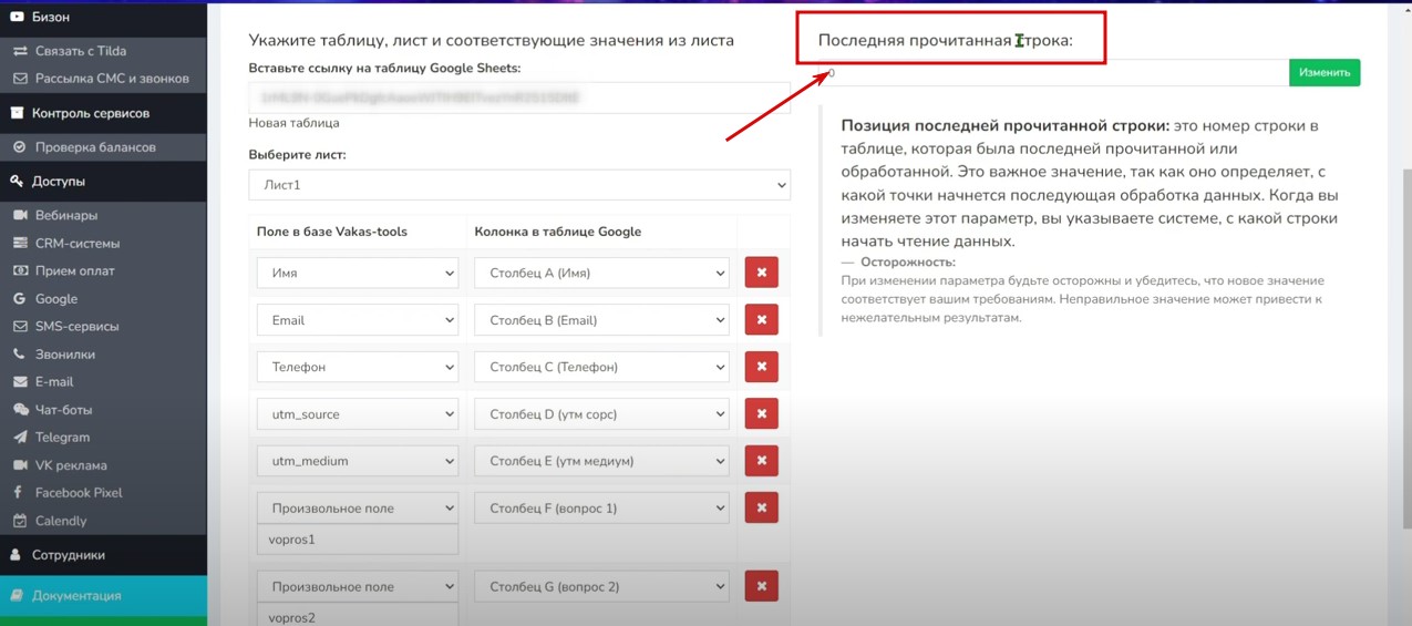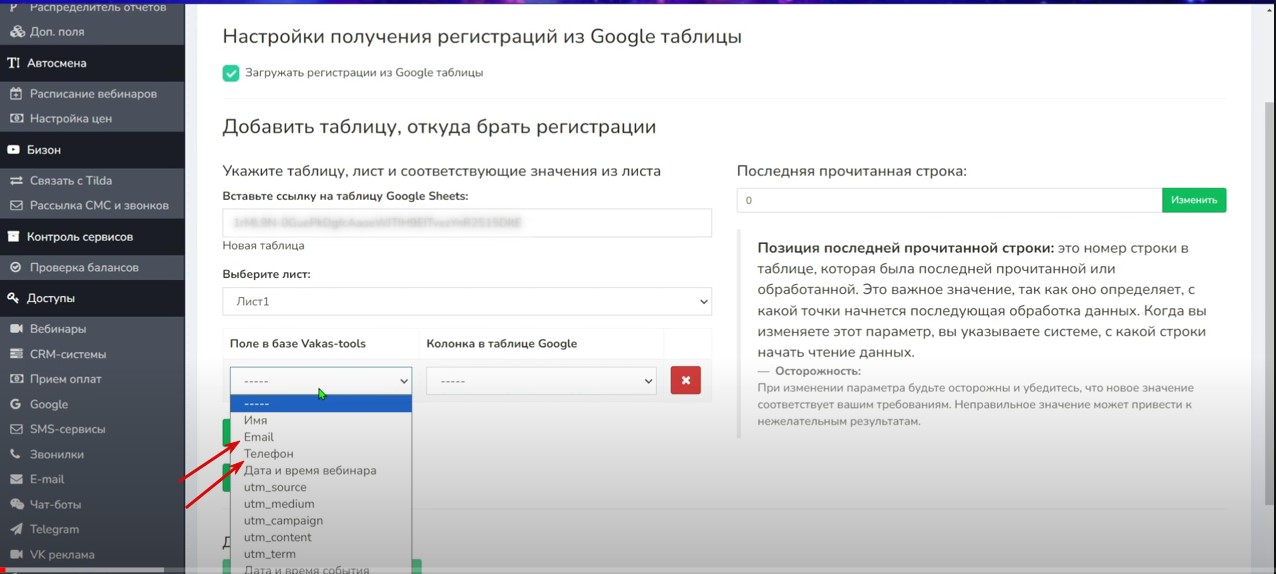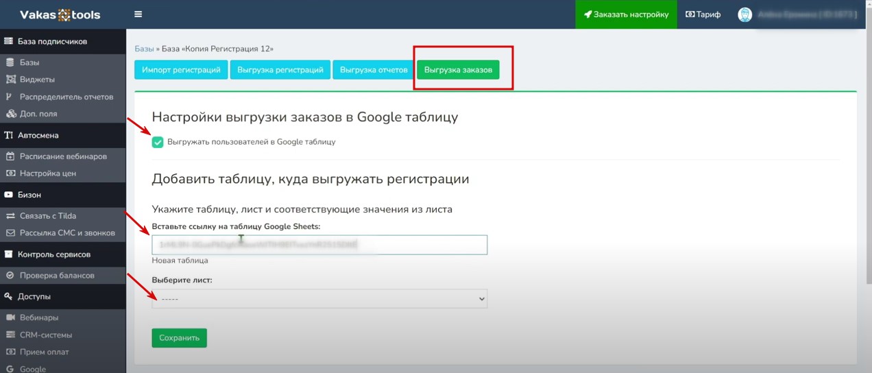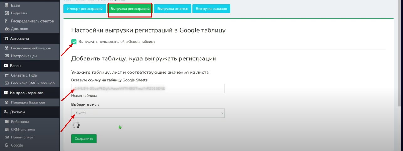 1 Ставим галочку «Выгружать пользователей в Google таблицу»