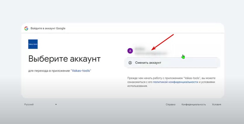 2 Выберите аккаунт Google, который нужно подключить к Vakas-tools