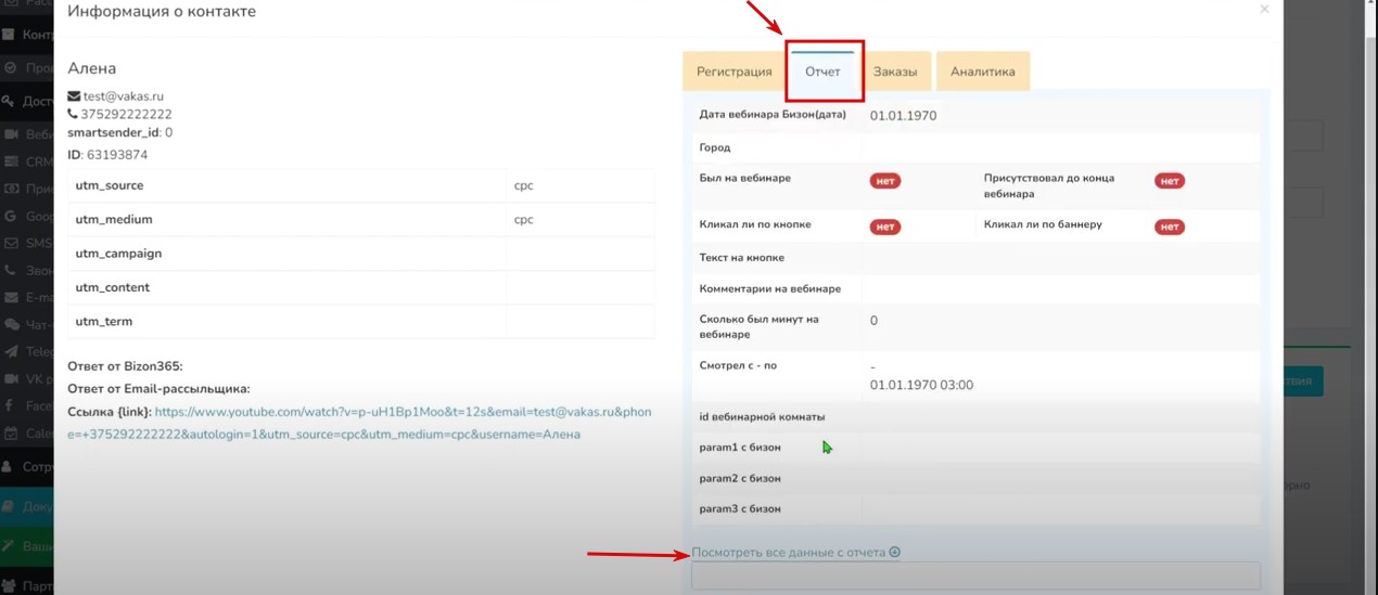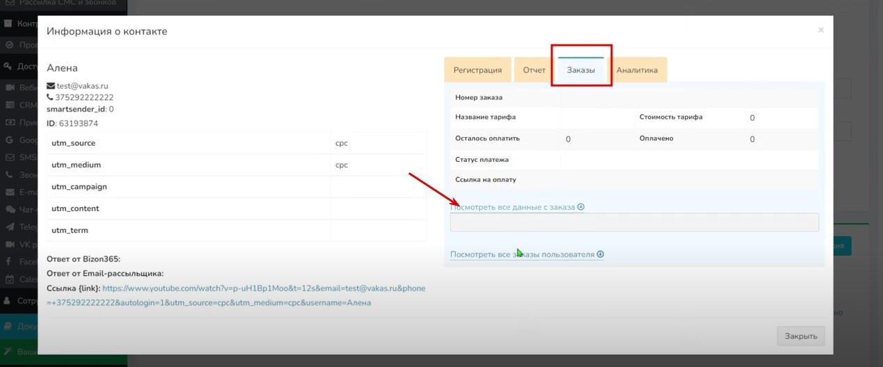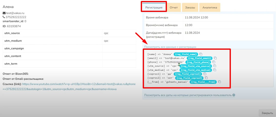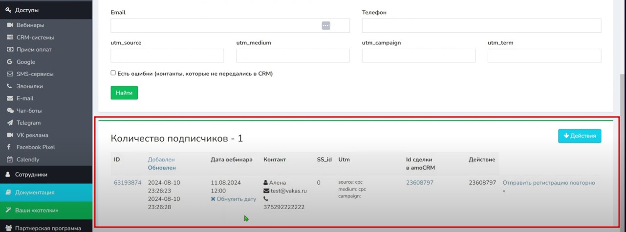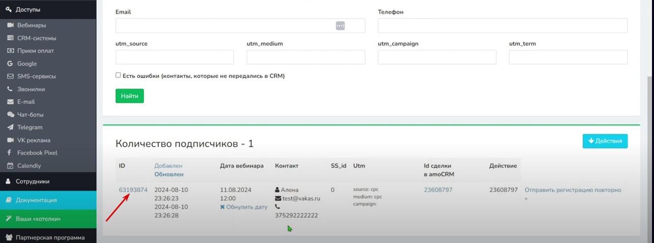 При клике на id подписчика можно посмотреть всю информацию, которая пришла в Базу.