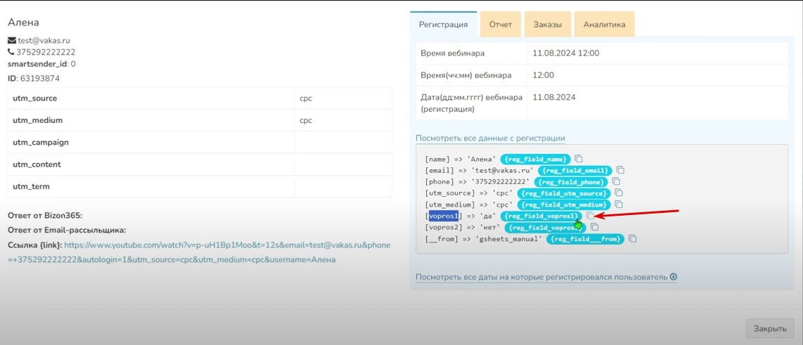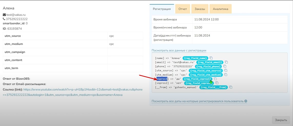 Значение переменной для произвольного поля берем из карточки подписчика, кликнув на его id, из вкладки Заказы, копируем из квадратных скобок только имя переменной, например vopros1.