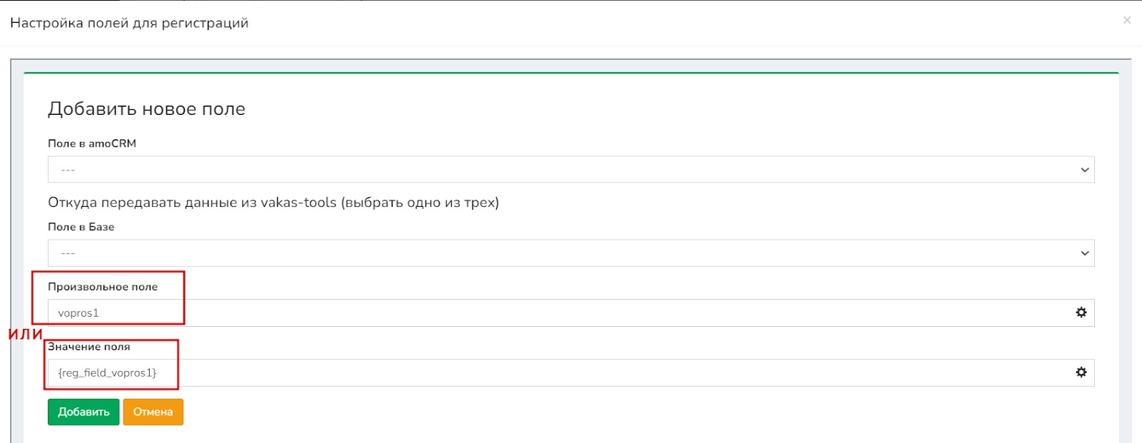 Заполняется одно из полей: или Произвольное поле, или Значение поля.