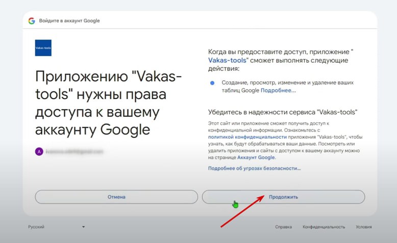 3 Для предоставления прав доступа Vakas-tools к нужному аккаунту Google нажмите «Продолжить»