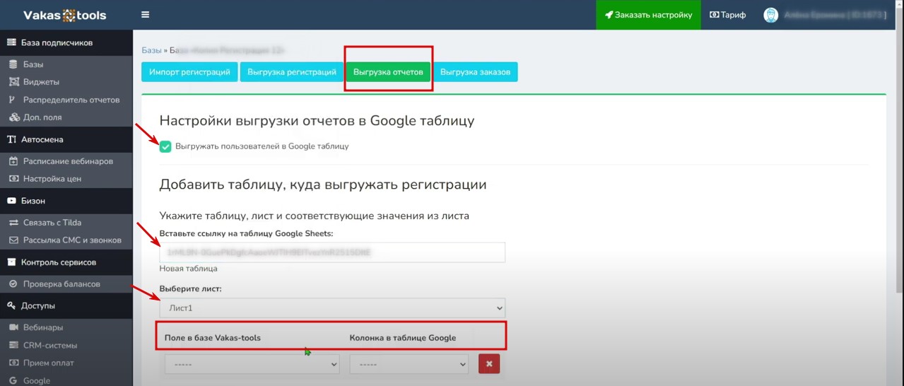 Для выгрузки отчетов — вкладка Выгрузка отчетов (из Базы Vakas-tools в Google таблицу). Настройки выполняются аналогично предыдущим.
