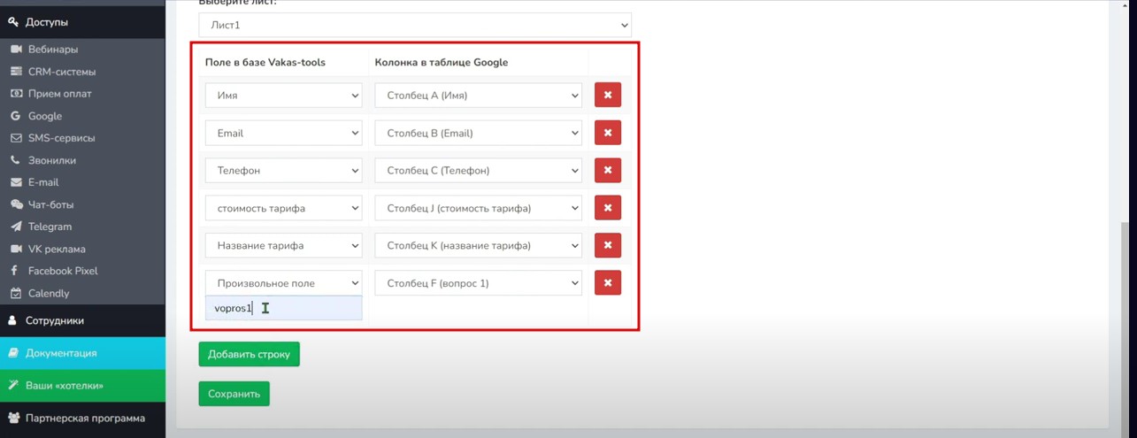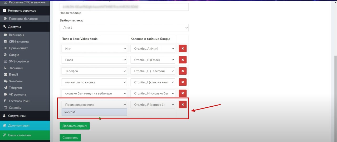 Рекомендуем в названии переменной для Произвольного поля использовать латинские буквы, нижнее подчеркивание, НО не используйте кириллицу. Таких переменных может быть несколько, если нужно. Для добавления строк используйте кнопку Добавить строку.