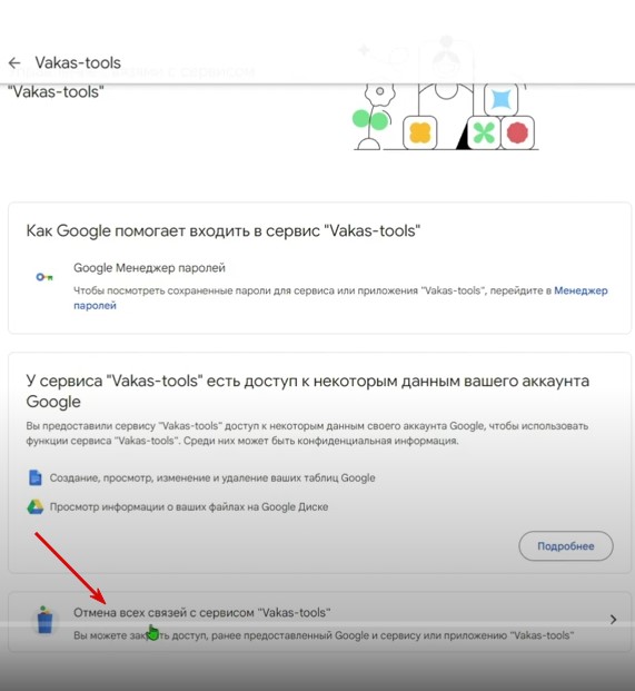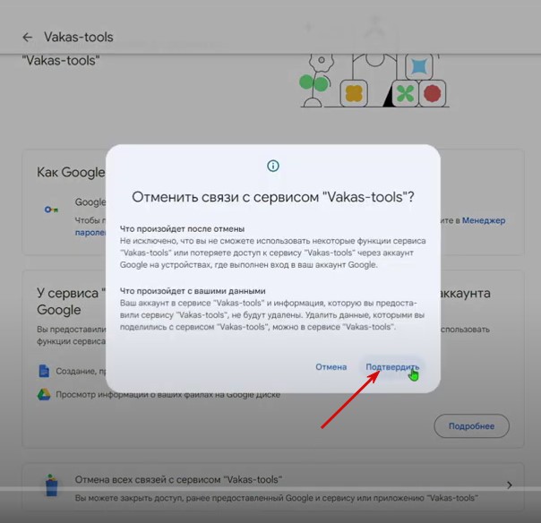 3 Нажмите на кнопку «Отмена всех связей с сервисом Vakas-tools» и далее «Подтвердить»