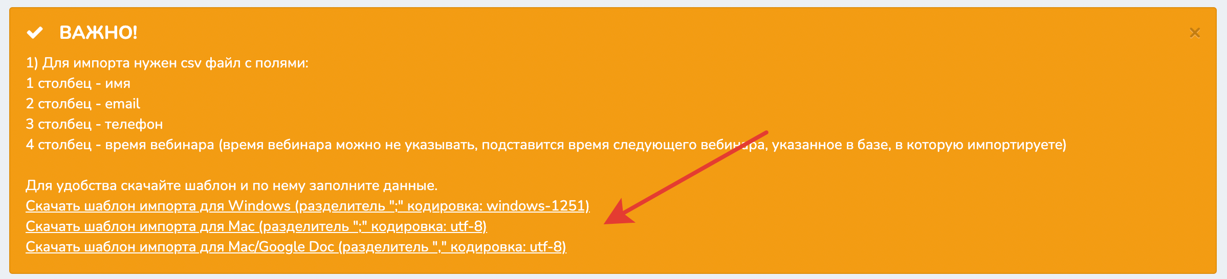 | 4 | Время вебинара (можно не указывать, подставится время следующего вебинара, указанное в базе, в которую импортируете) |
