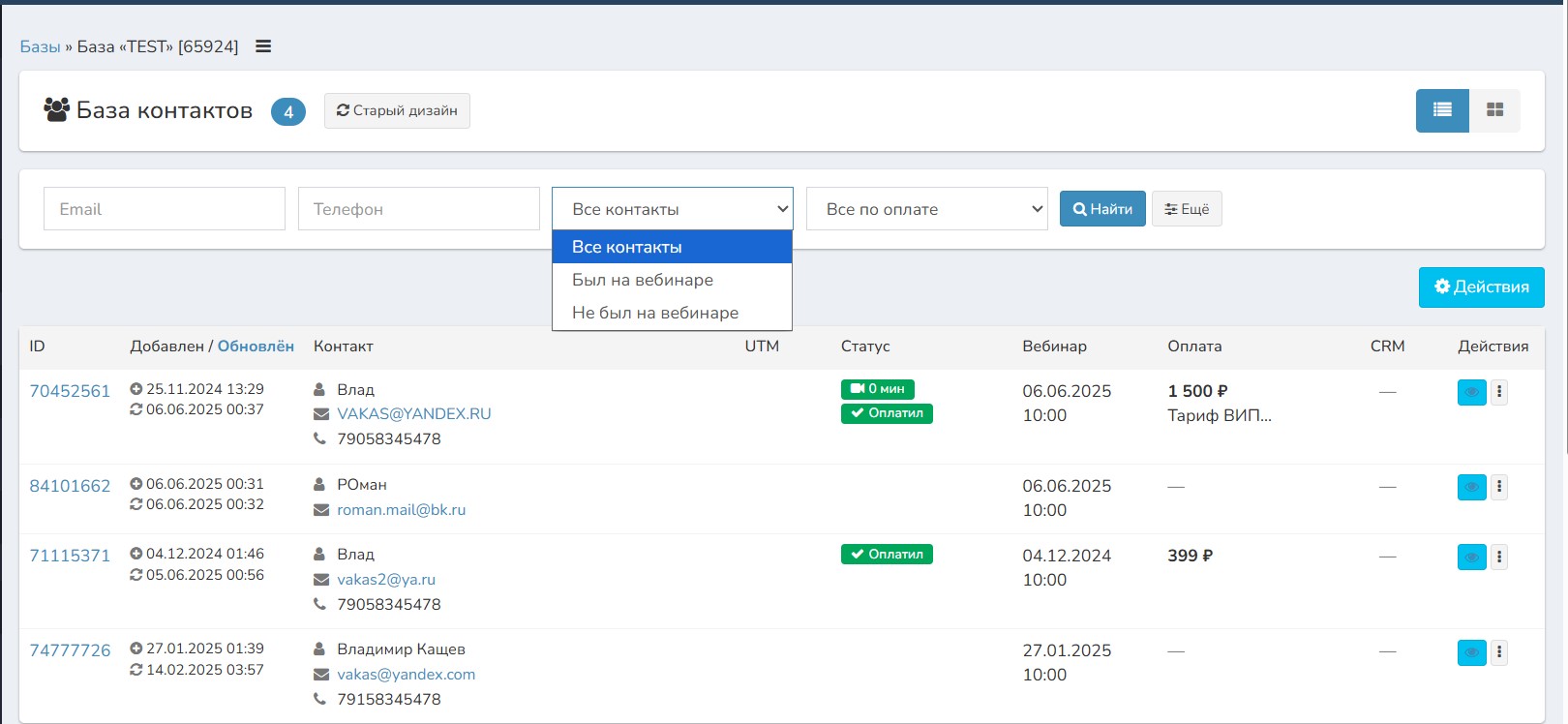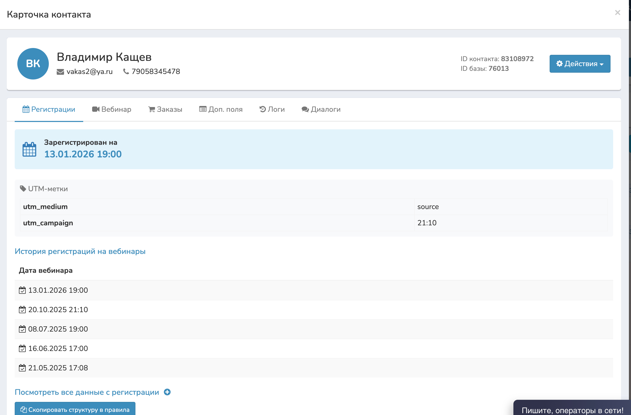 - Кто это, контакты, ID контакта, ID базы.