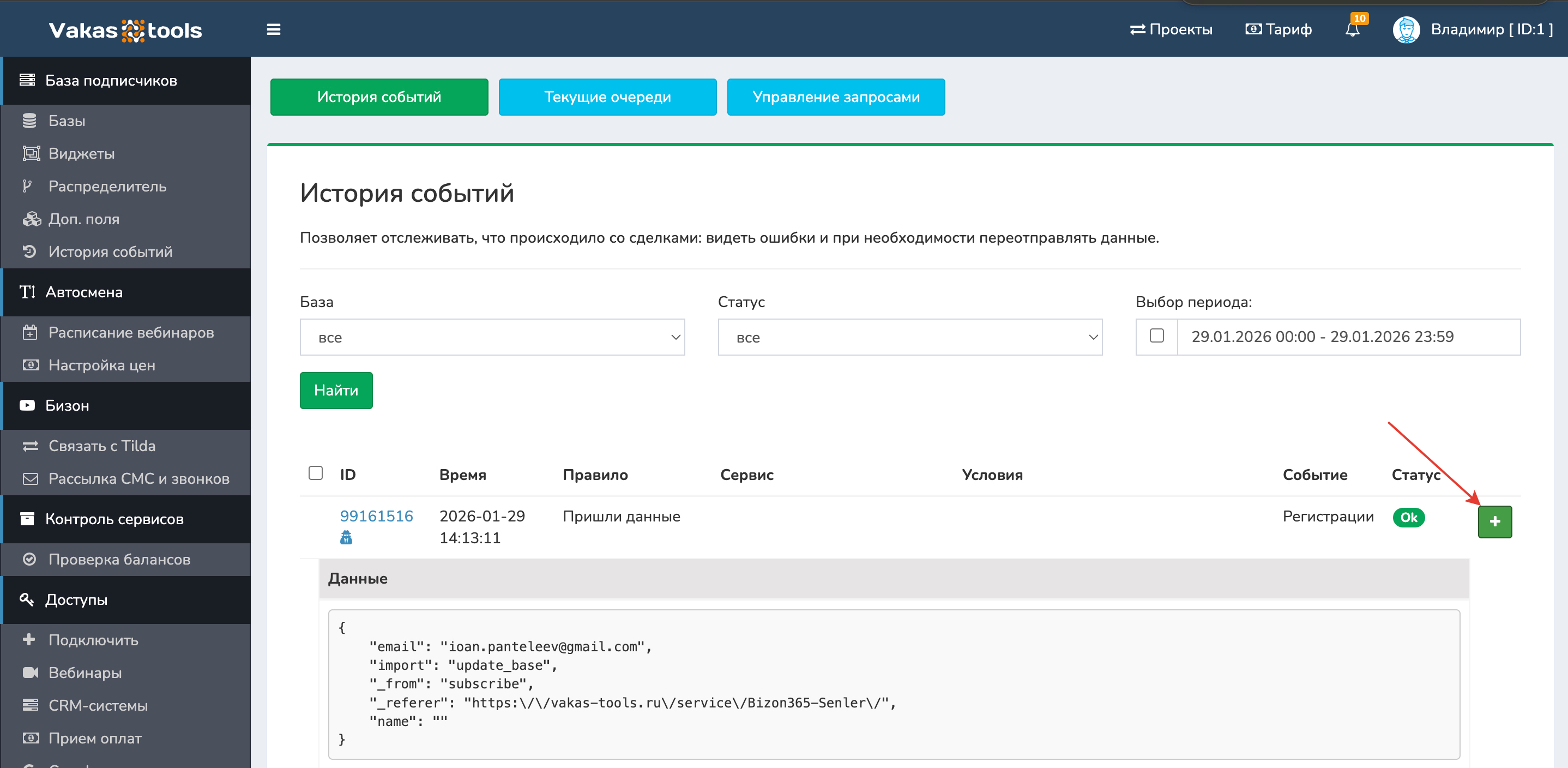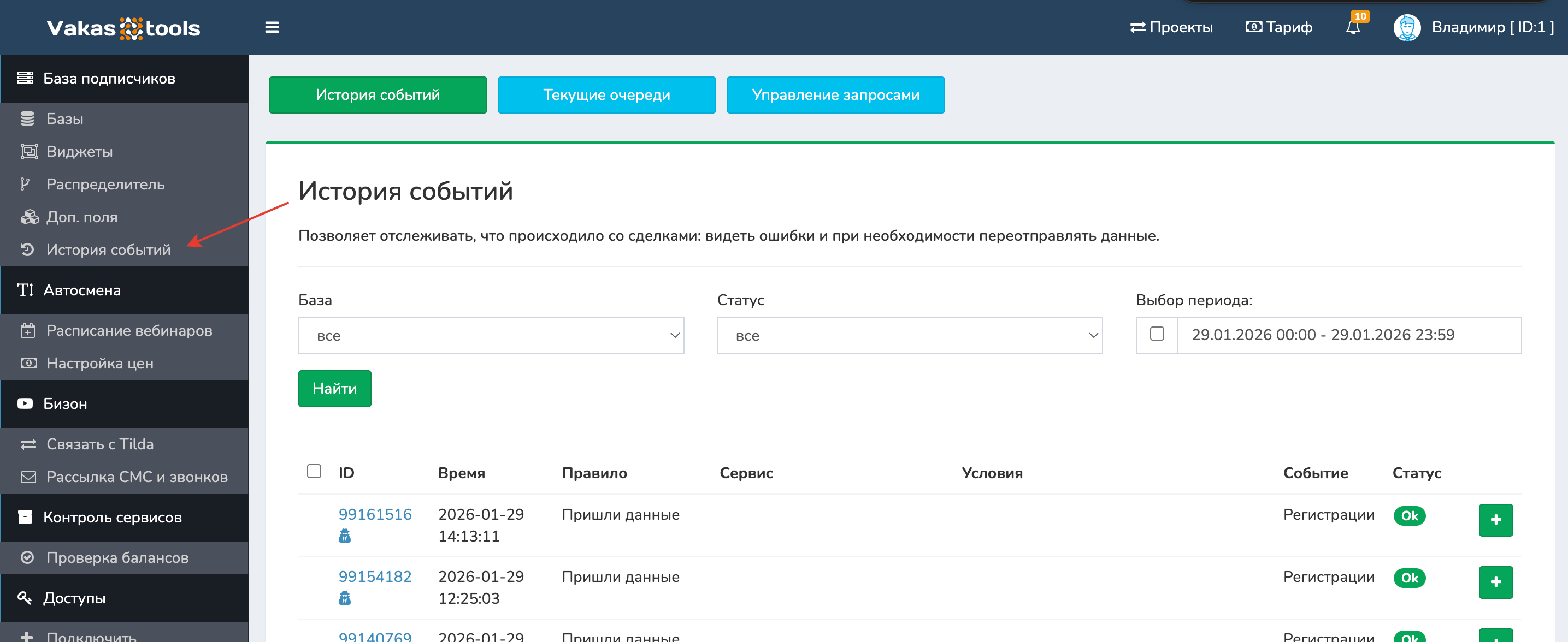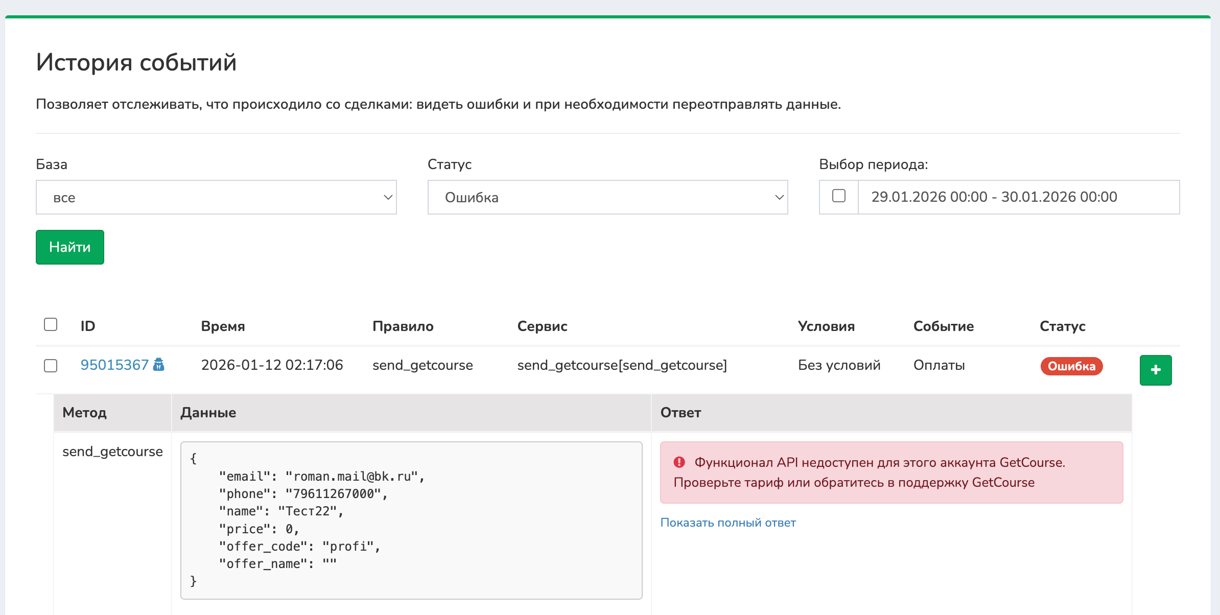 Раздел «История событий» предназначен для контроля передачи данных по контактам и исправления ошибок при интеграциях с другими сервисами. Если при передаче произошёл сбой (регистрация, отчёт, оплата), данные можно переотправить повторно прямо из этого раздела.