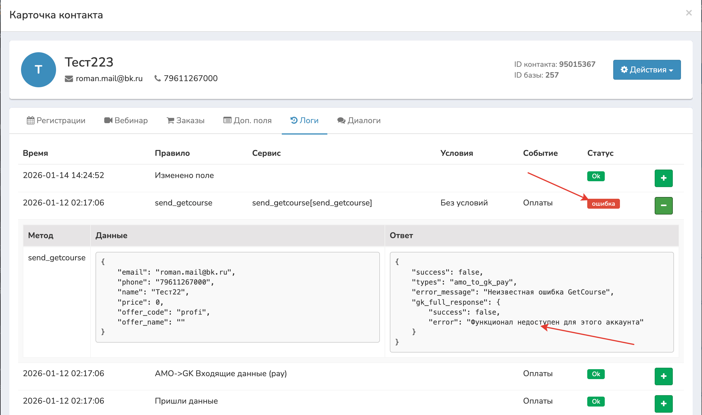 - Логи — что и когда происходило. Можно посмотреть конкретно, почему не передался контакт.