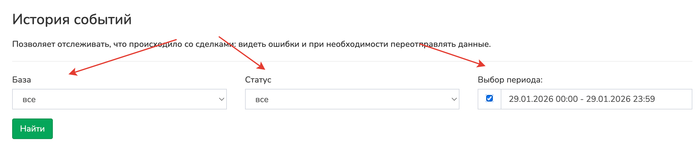 Фильтры помогают быстро найти ошибки или нужные события для повторной отправки.