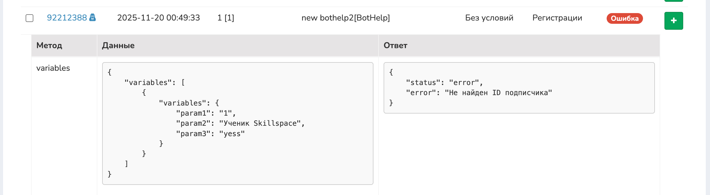 - текст ошибки, (например: «Функционал недоступен для этого аккаунта», «Не найден ID подписчика»).