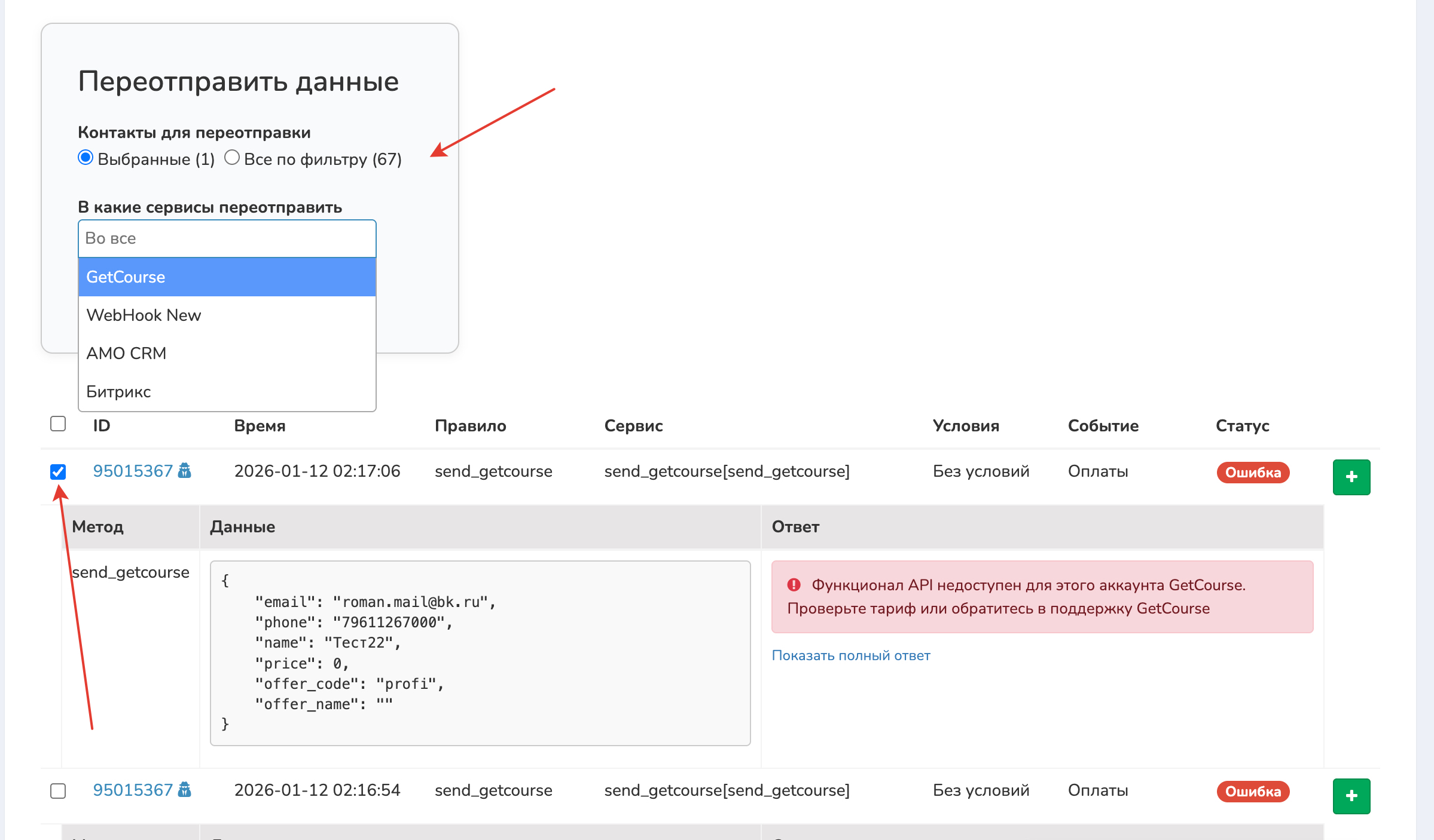 - Если выбраны конкретные сервисы — отправка произойдёт только в них (например, повторно только в GetCourse).