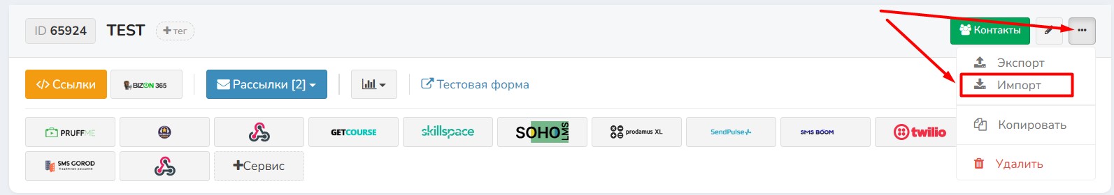 Чтобы импортировать базу подписчиков, нужно зайти в раздел базы и у нужной нажать кнопку [Импортировать базу].