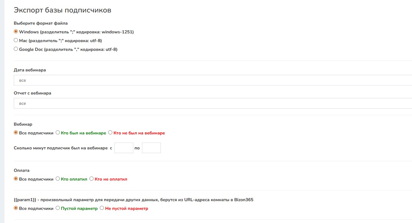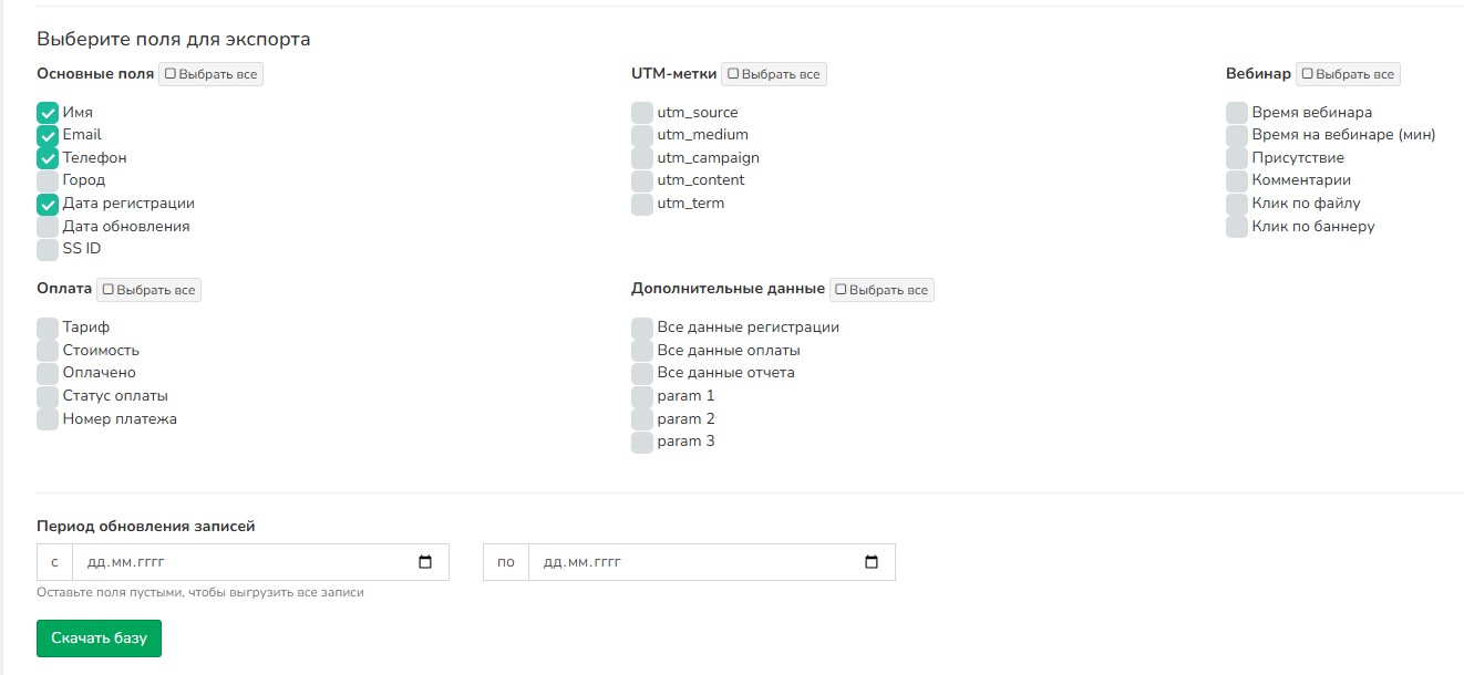 Чтобы экспортировать базу подписчиков, нужно зайти в раздел базы и у нужной нажать кнопку [Экспорт базы]. Базу можно скачать с разными параметрами.