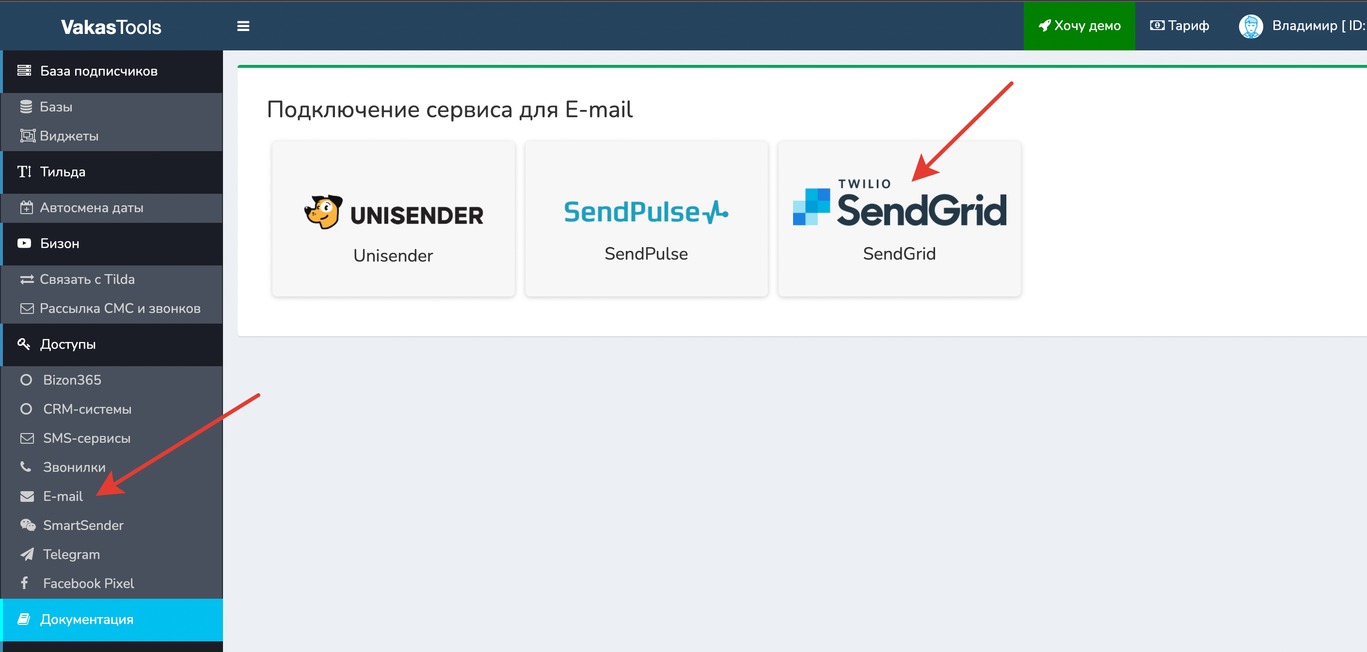1. Слева в меню «Доступы» нажимаете «SendGrid».