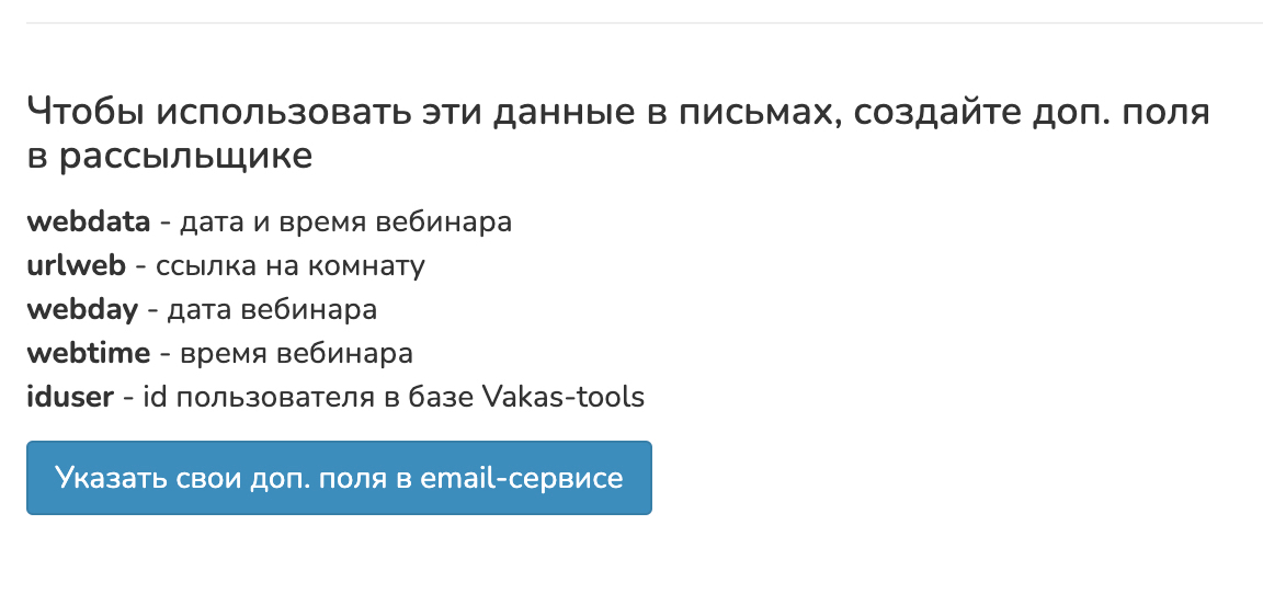 Если нужны другие доп. поля, то по кнопке [Указать свои доп. поля в email-сервисе] можно создать свои доп. поля в Vakas-tools и потом их использовать в шаблоне в SendGrid. Используется только в случае, если нужно еще какие-то данные передавать в Sendgrid, например utm-метки, номер телефона.