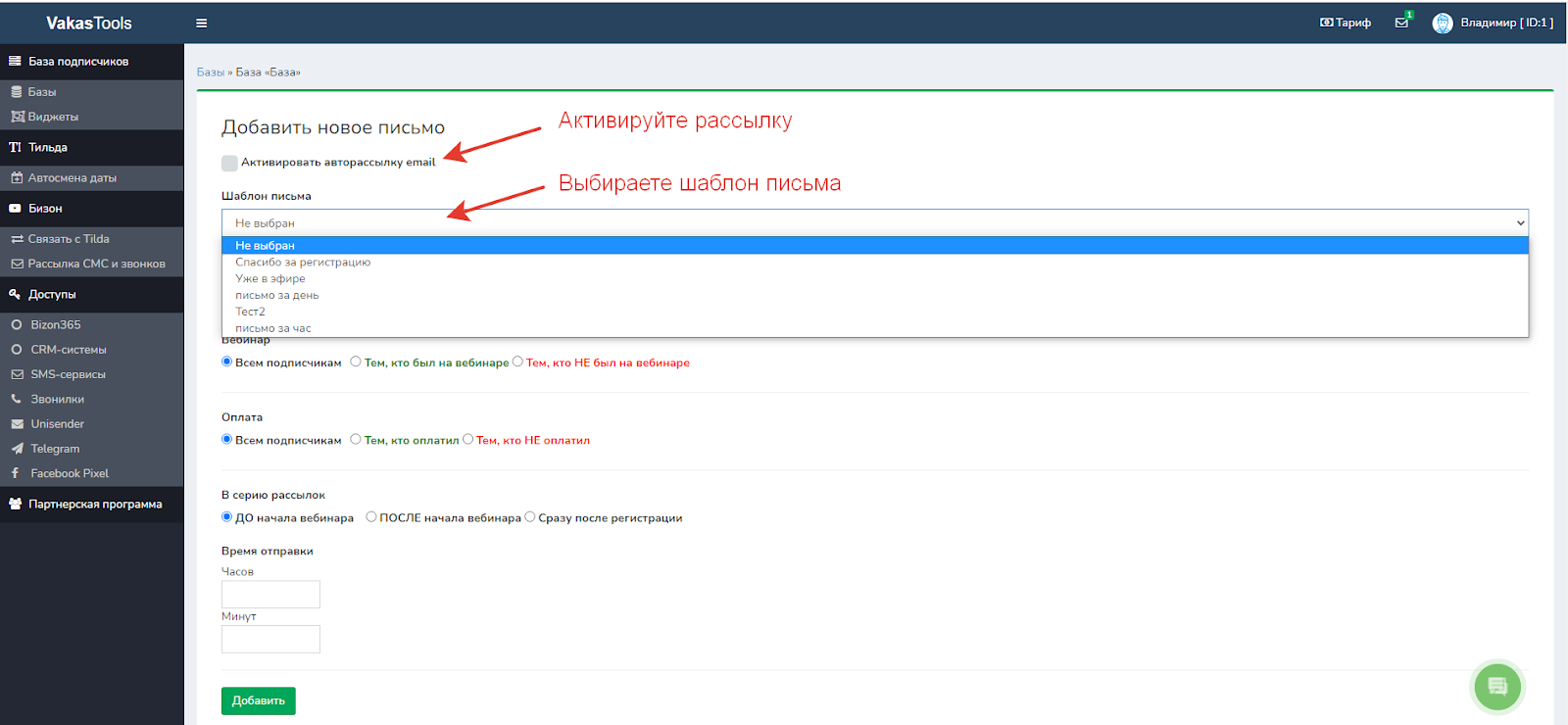 5. Время отправки пишите относительно начала вебинара. Например вебинар в 20.00, создаете рассылку писем за час, тогда пишите в Время отправки 1 час 0 минут, если рассылка за 10 минут, пишите 0 часов 10 минут.