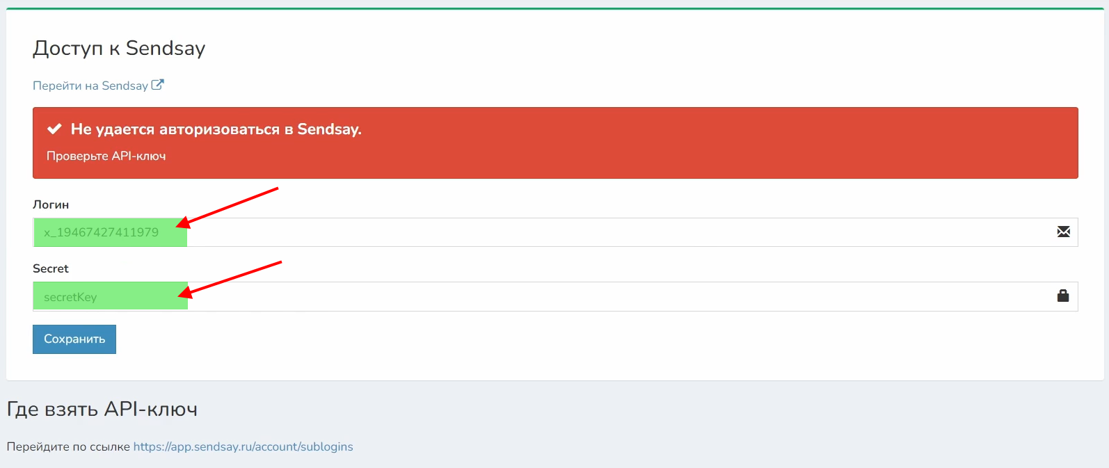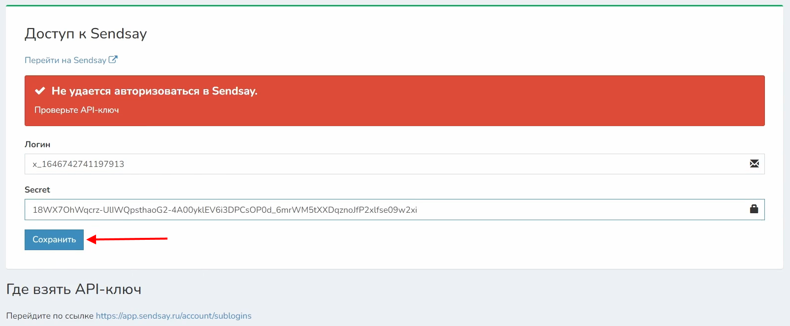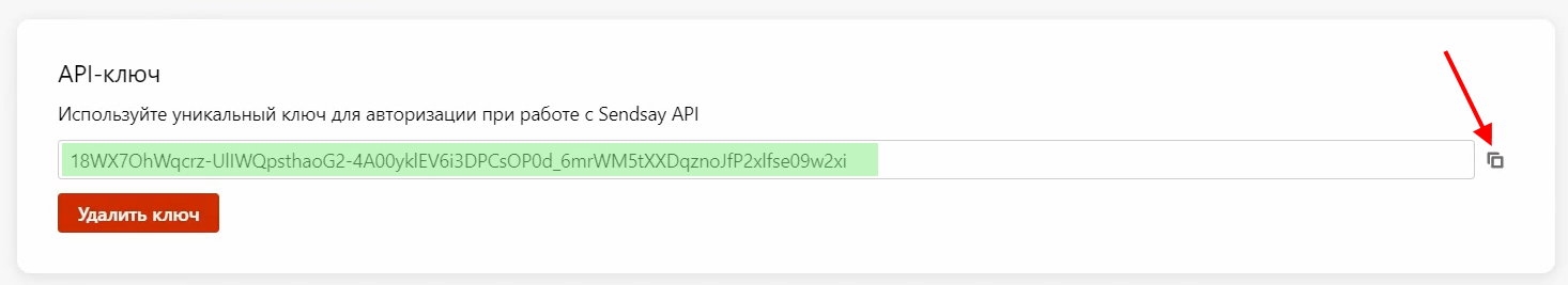 3 В поле API-ключ нужно вставить код, скопированный в вашем сервисе «Sendsay»