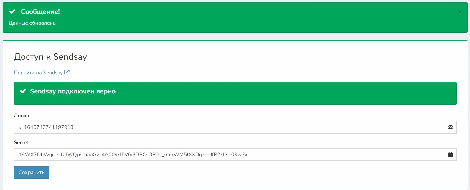 После всех настроек, сервис «Sendsay» поймет, что конкретно из карточки клиента в Vakas-tools нужно подставить при рассылке писем. Нажмите на кнопку «Сохранить» и повторно «Сохранить».