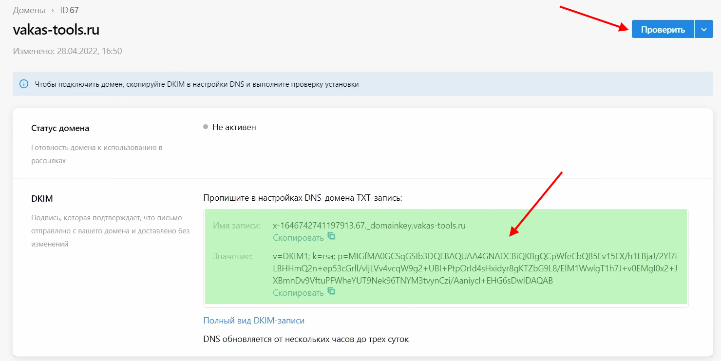 3 После добавления домена его нужно подтвердить. Для этого необходимо прописать данные на стороне регистратора домена. Затем нажать на кнопку «Проверить»