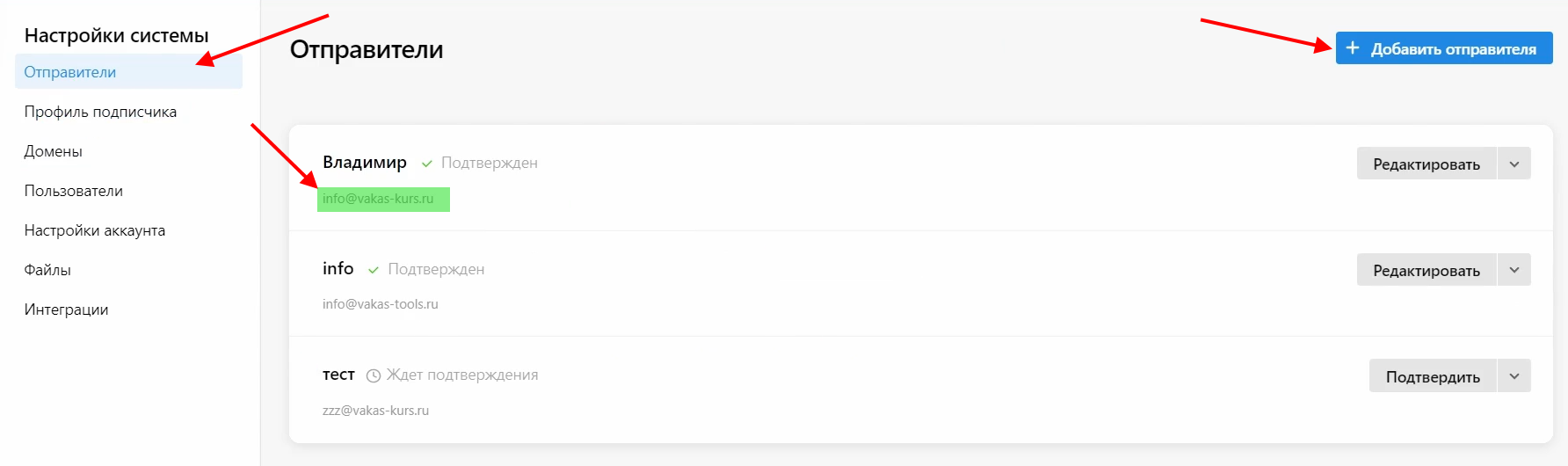 Для этого перейдите в «Настройки системы» — «Отправители» и нажмите на кнопку «Добавить отправителя». Доменную часть email скопируйте из «Настройки системы» — «Домены». Наименование email придумайте самостоятельно. Например, pro@vakas-kurs.ru, где pro — самостоятельно придуманное наименование, а vakas-kurs.ru — подтвержденный домен.