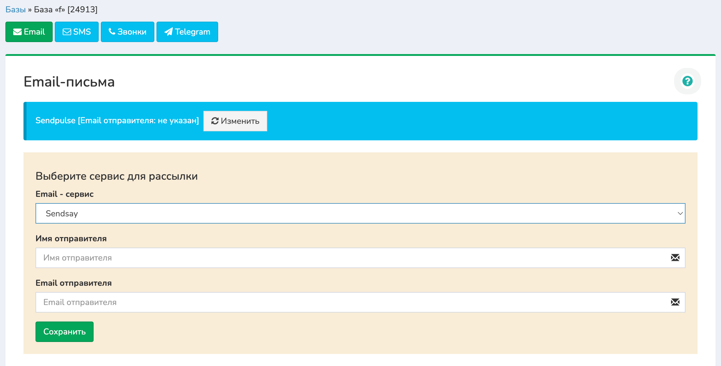 2 В настройках «Email» выберите сервис «Sendsay». Укажите имя отправителя и его email