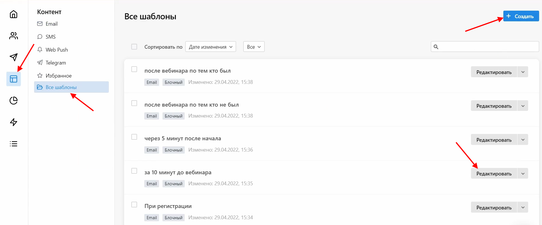 1 Слева в меню выбираем пункт «Контент» — «Все шаблоны»