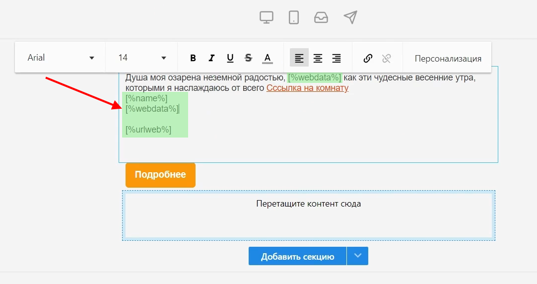 1 Копируем нужный шорткод, например webdata, возвращаемся в шаблон вашего письма, и вставляем его