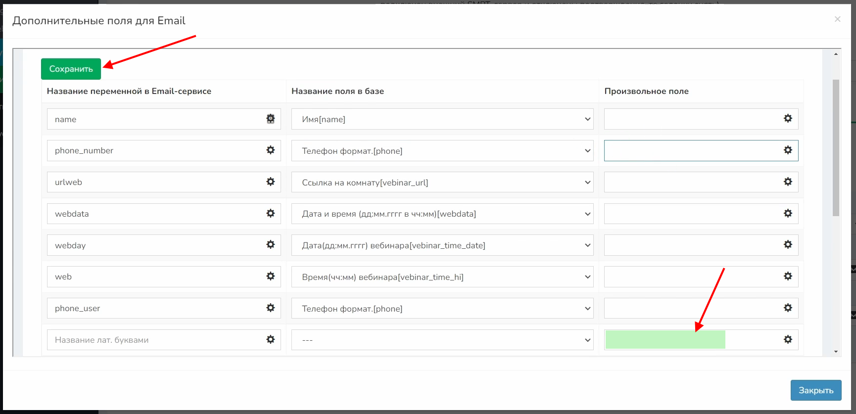 Название переменной в «Email-сервисе» — phone, название поля в базе — Телефон;