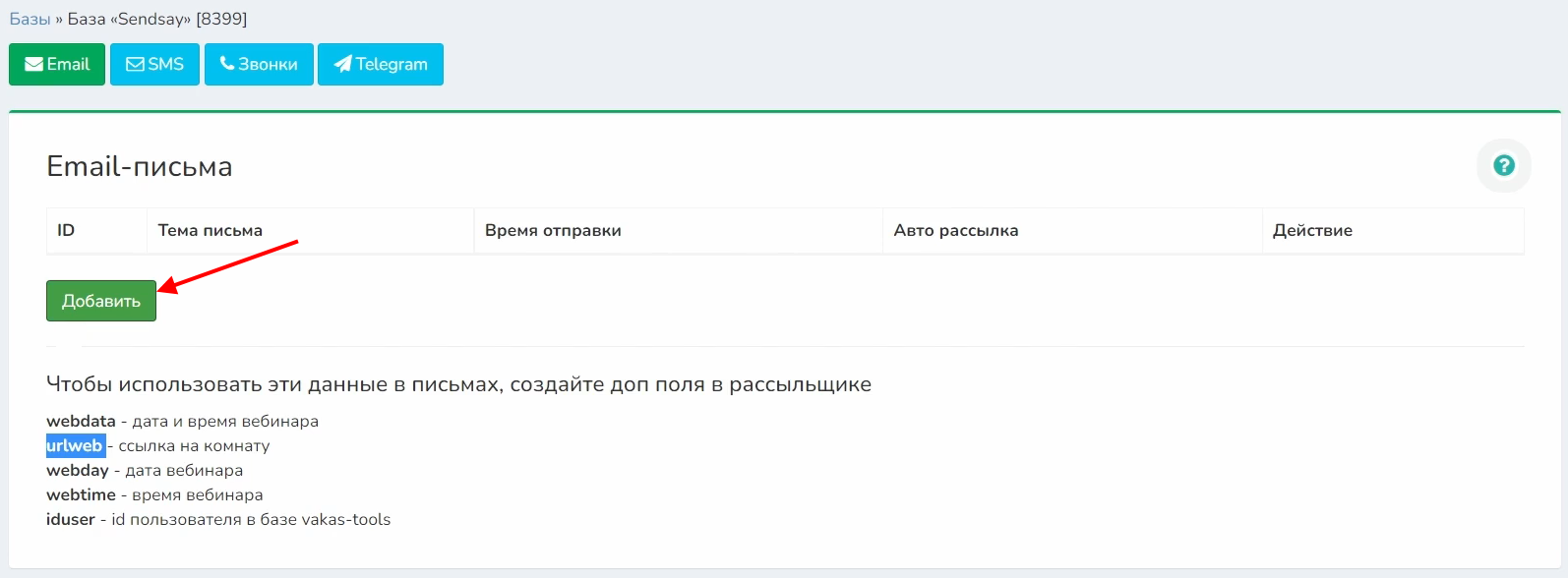 Настройка рассылки в базе Vakas-tools