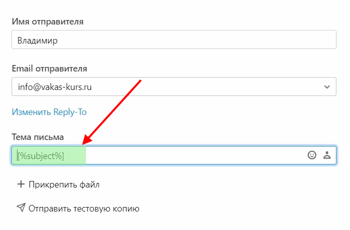 Если же вы хотите указать тему письма в Vakas-tools, в шаблоне в «Sendsay» в теме письма нужно указать шорткод [%subject%].
