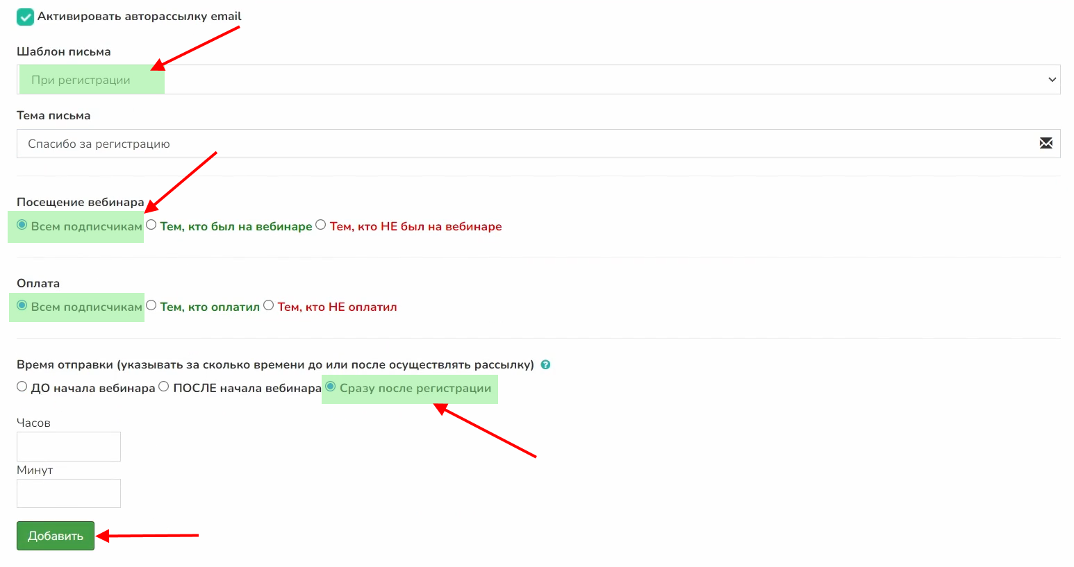 Например, для рассылки «При регистрации» выбираем «Всем подписчикам» и «Сразу после регистрации».