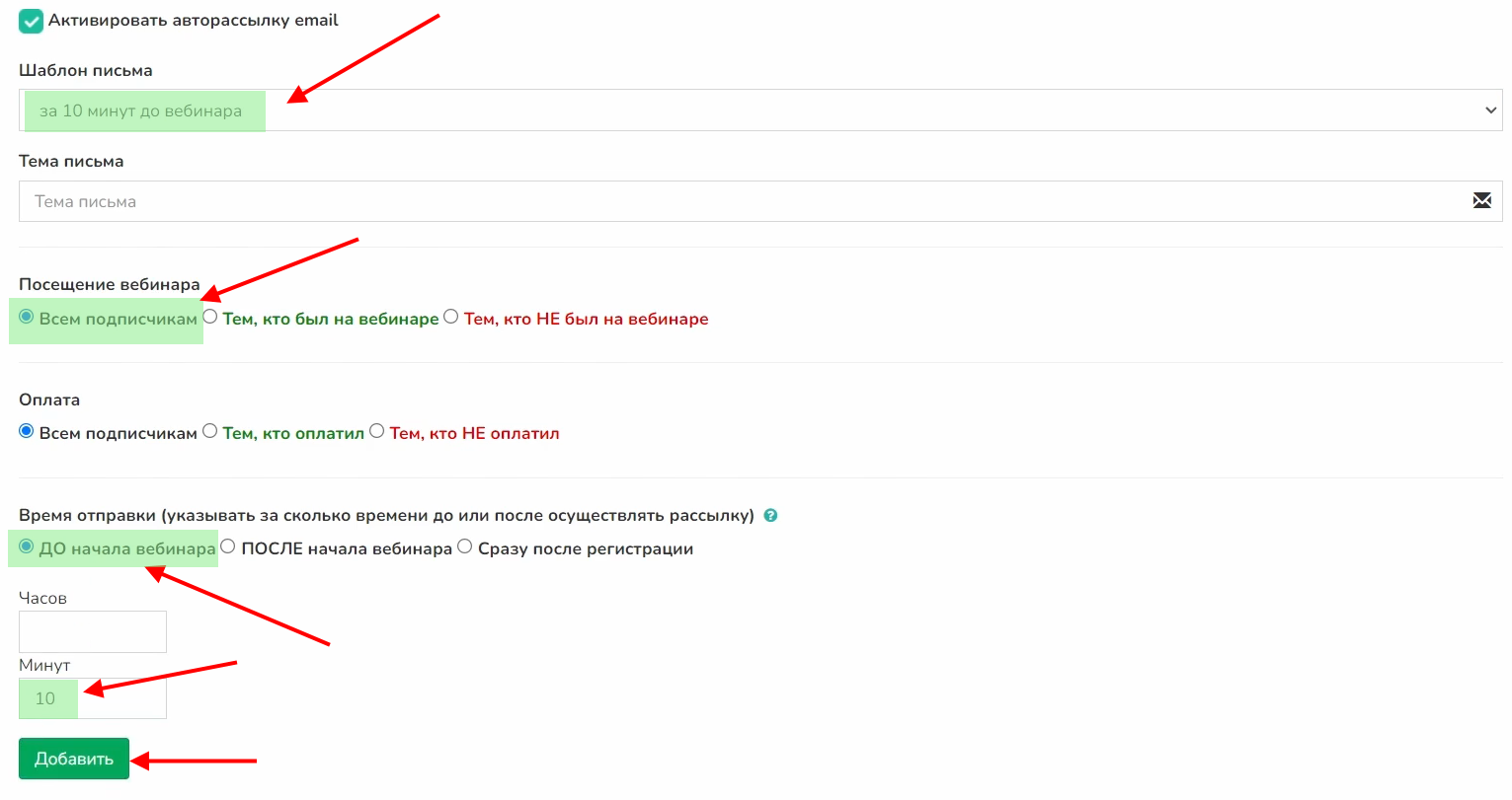 Выбираем шаблон «за 10 минут до вебинара», «Всем подписчикам» и «До начала вебинара». Указываем количество минут «10». Нажимаем на «Сохранить». Таким образом, если вебинар должен начаться в 19:00, участники вебинара получат письмо в 18:50.