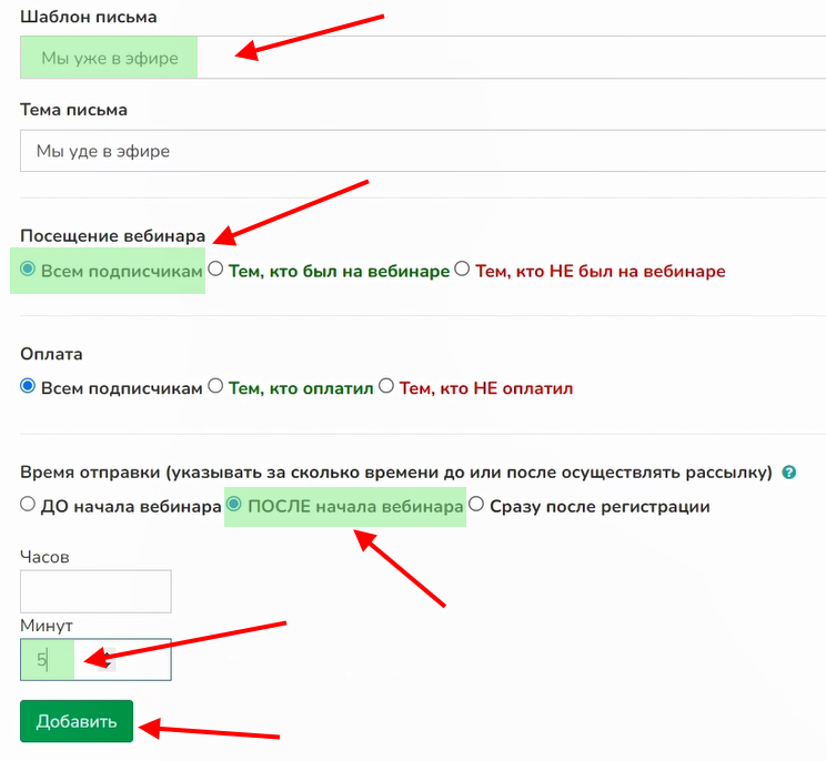 Выбираем шаблон «через 5 минут после начала», устанавливаем «Всем подписчикам» и «После начала вебинара». Количество минут указываем «5». То есть, если вебинар начинается в 19:00, письмо будет направлено в 19:05.