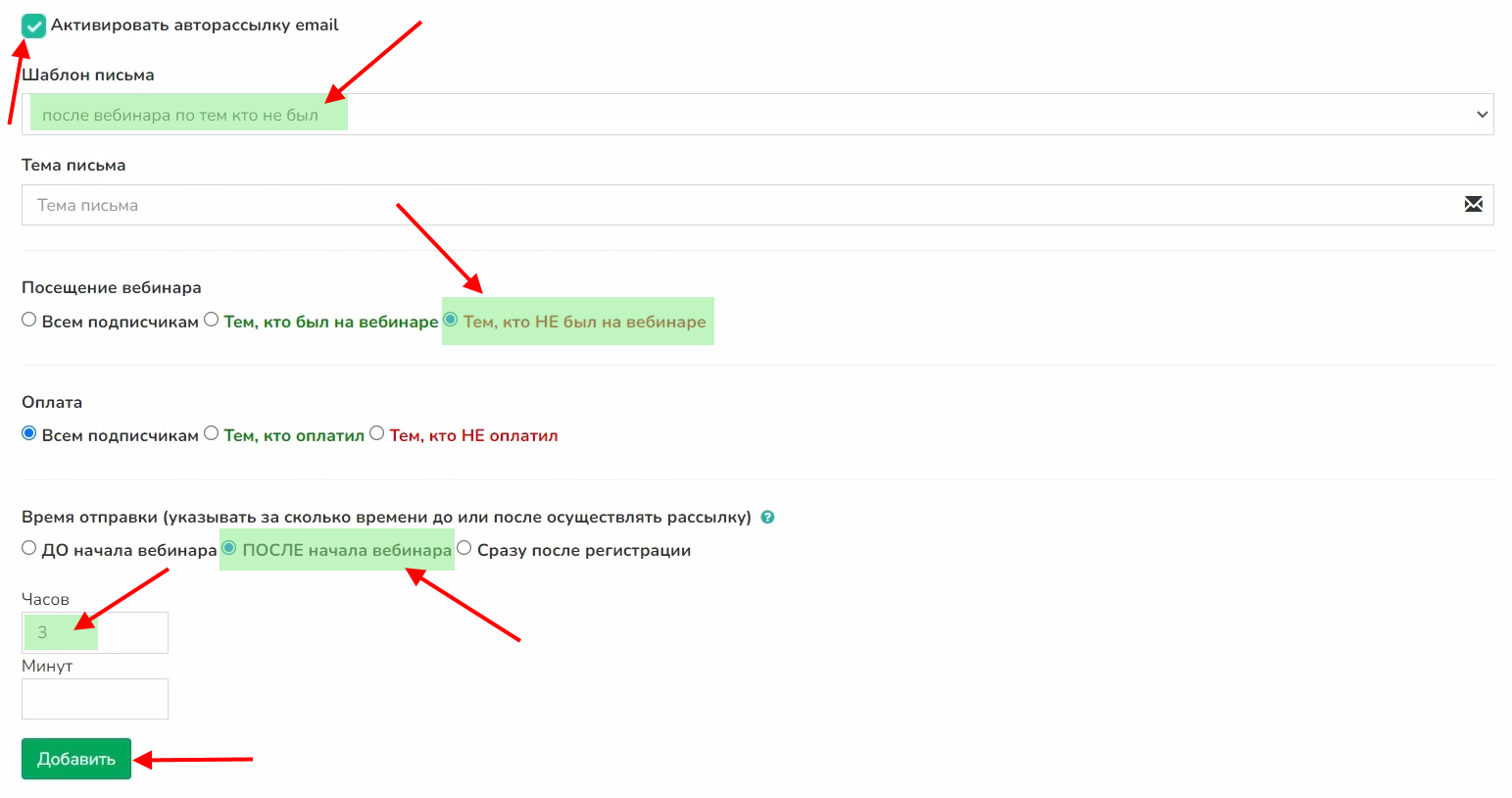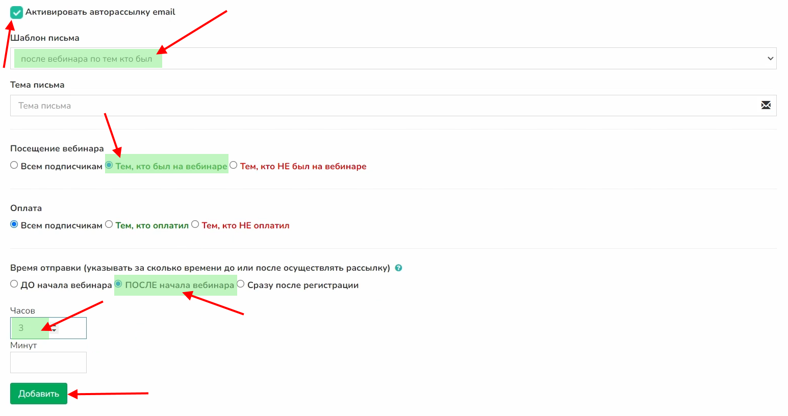 Выбираем шаблон «после вебинара по тем кто был», посещение вебинара «Тем, кто был на вебинаре», время отправки «После начала вебинара». Количество часов установите «3».
