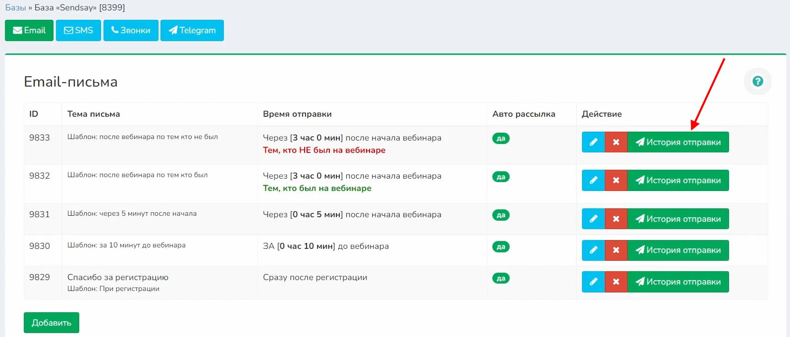 В истории отображаются только рассылки без сегментации получателей, поскольку рассылки только тем, кто был или не был на вебинаре, формируются непосредственно перед отправкой после получения отчета.