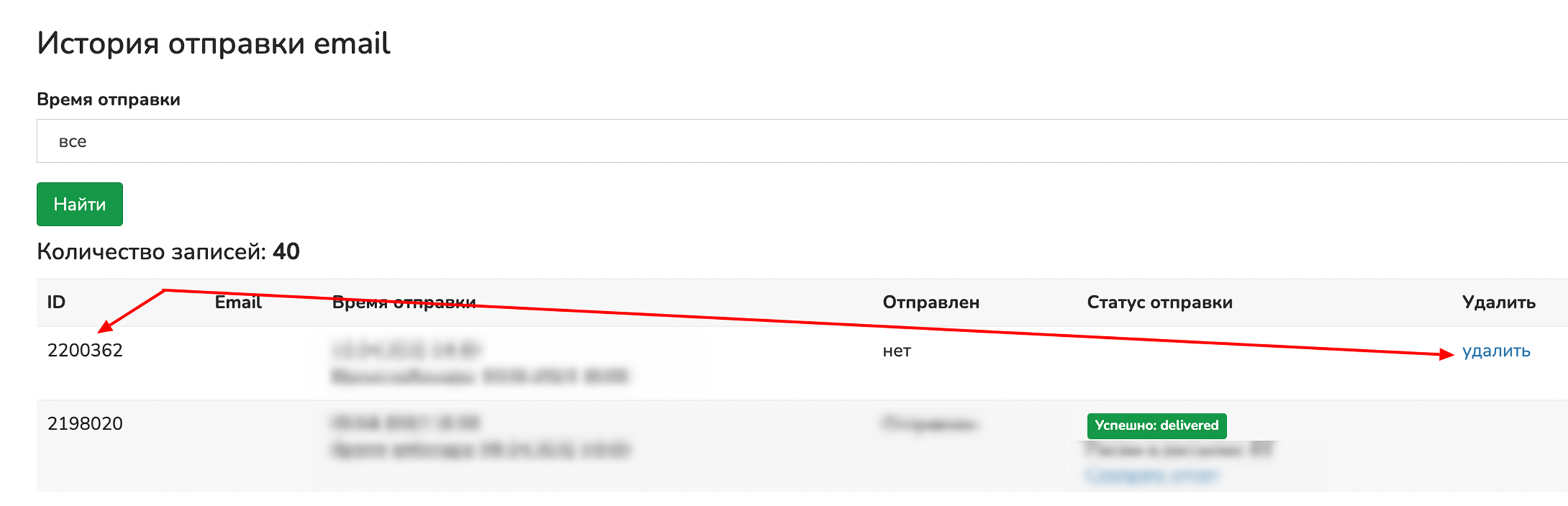 Для удаления очереди рассылки, нажмите пункт «История отправки сообщений». Найдите нужную рассылку и нажмите напротив неё кнопку «Удалить»