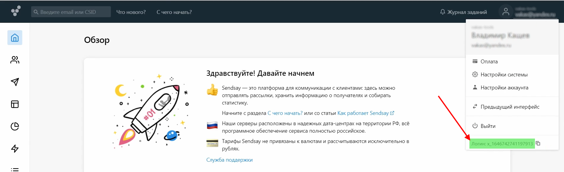 5 Перейдя по ссылке в сервис «Sendsay», в правом верхнем углу нажимаем на аккаунт. Копируем логин и вставляем в поле «Логин» в Vakas-tools