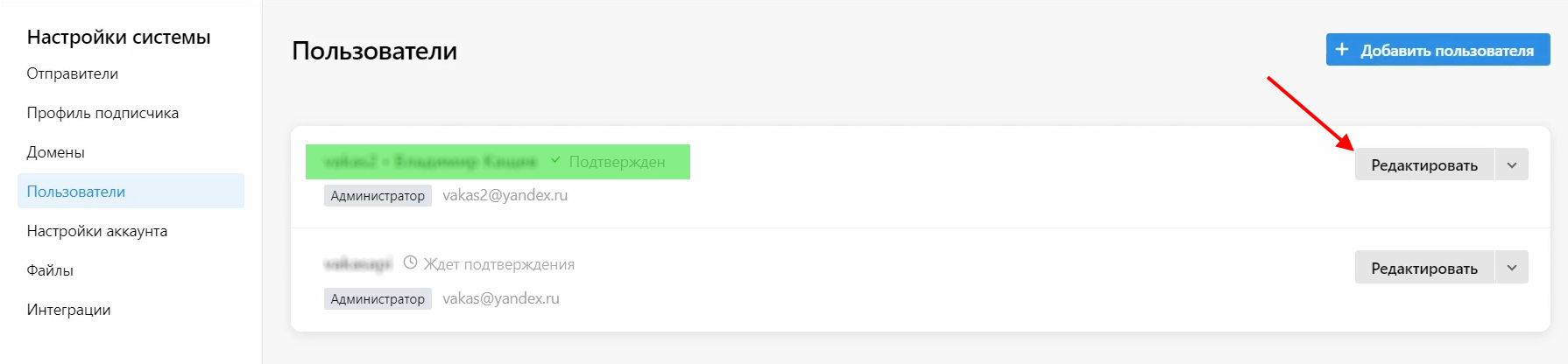 8 Напротив подтвержденного пользователя нажмите на «Редактировать»