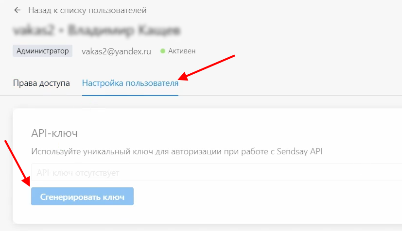 9 Перейдите во вкладку «Настройка пользователя» и нажмите на кнопку «Сгенерировать ключ»