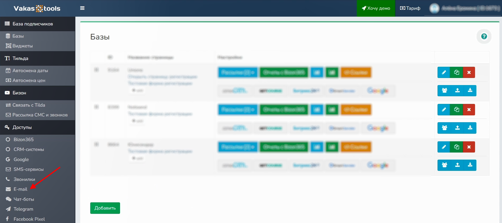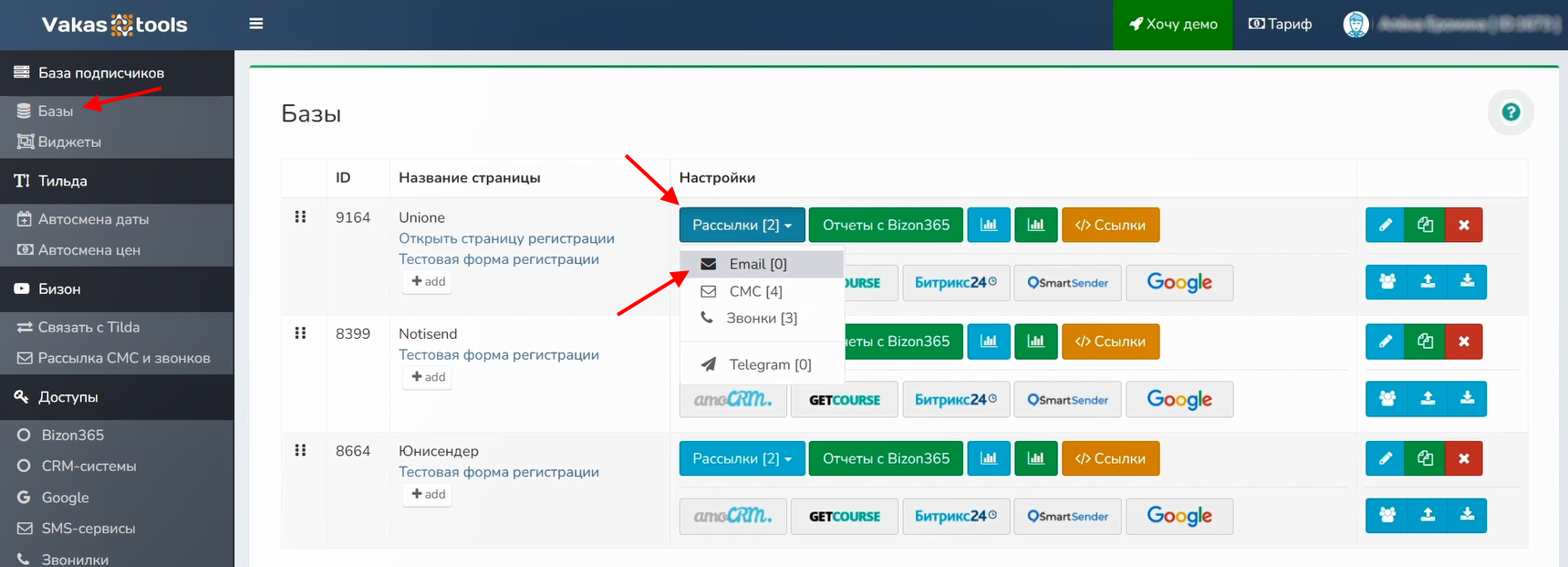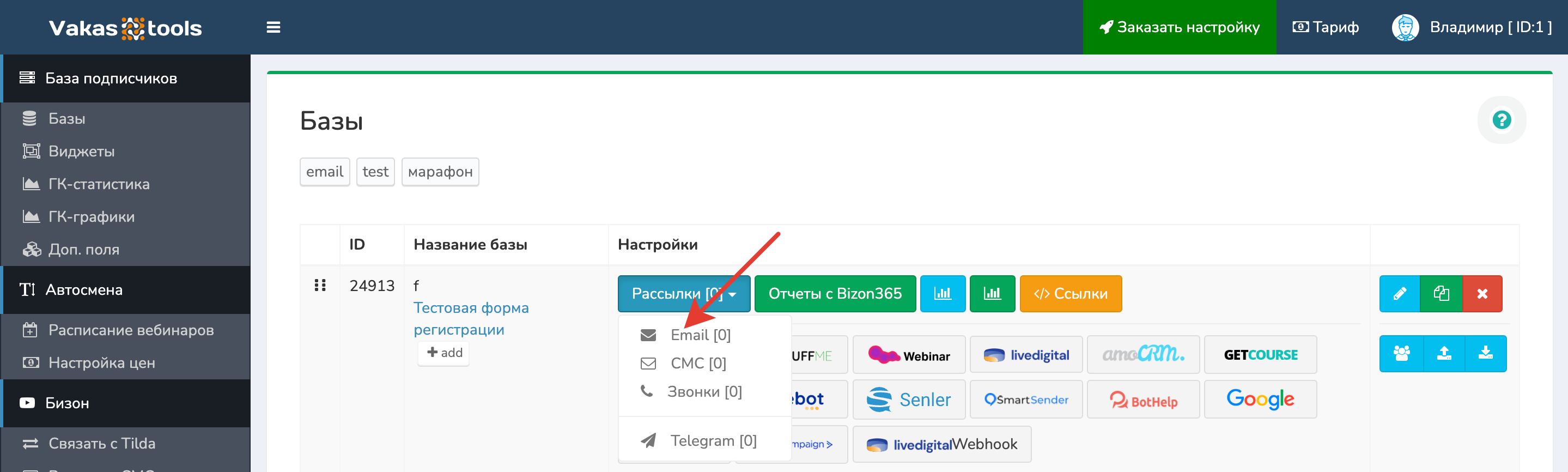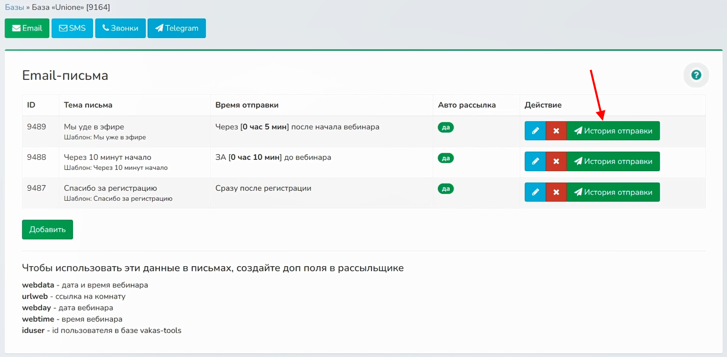 1 Перейдите в сервис Vakas-tools. В меню слева выберите «Базы», в базе «UniOne» нажмите на «Рассылки» — «Email»